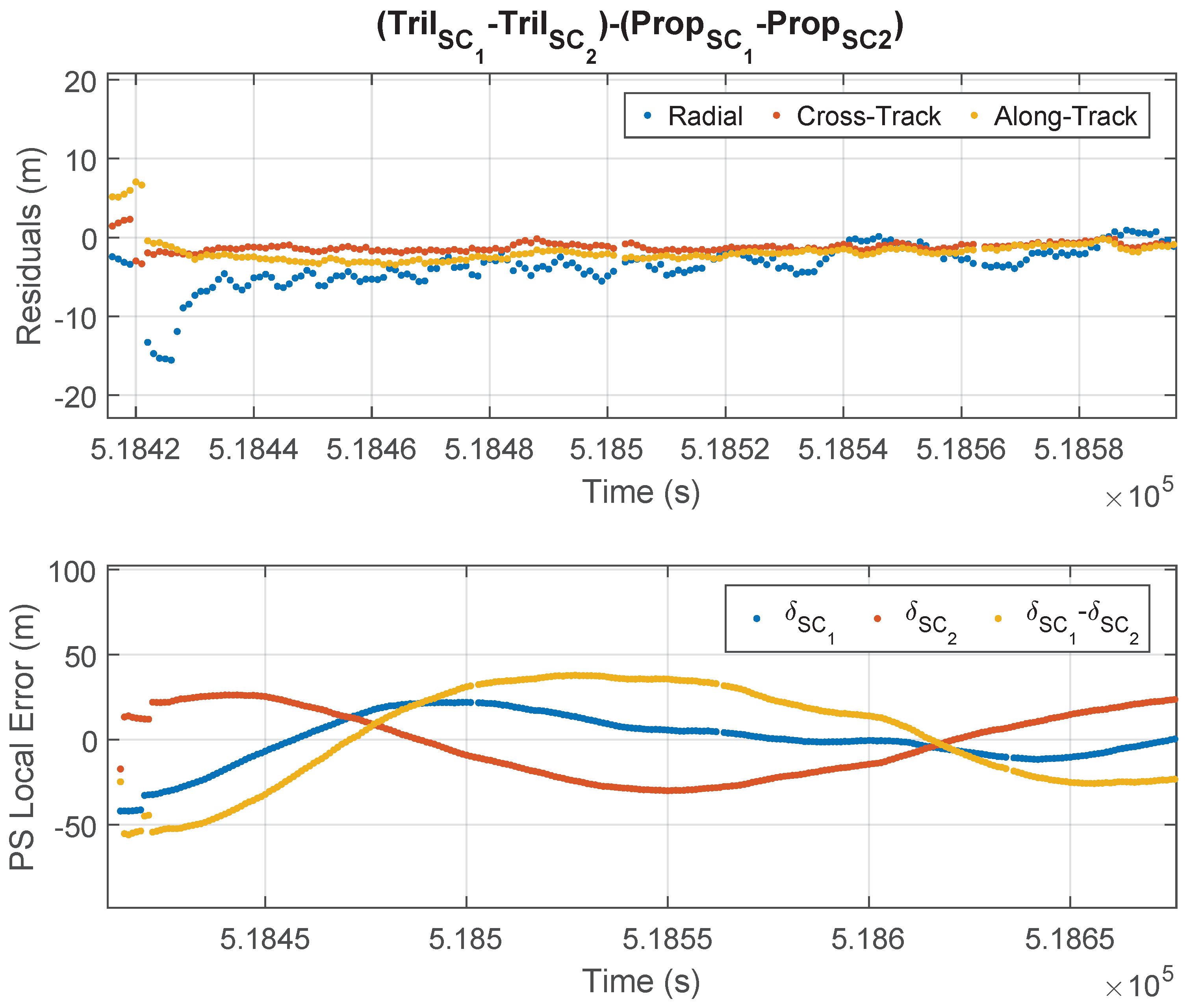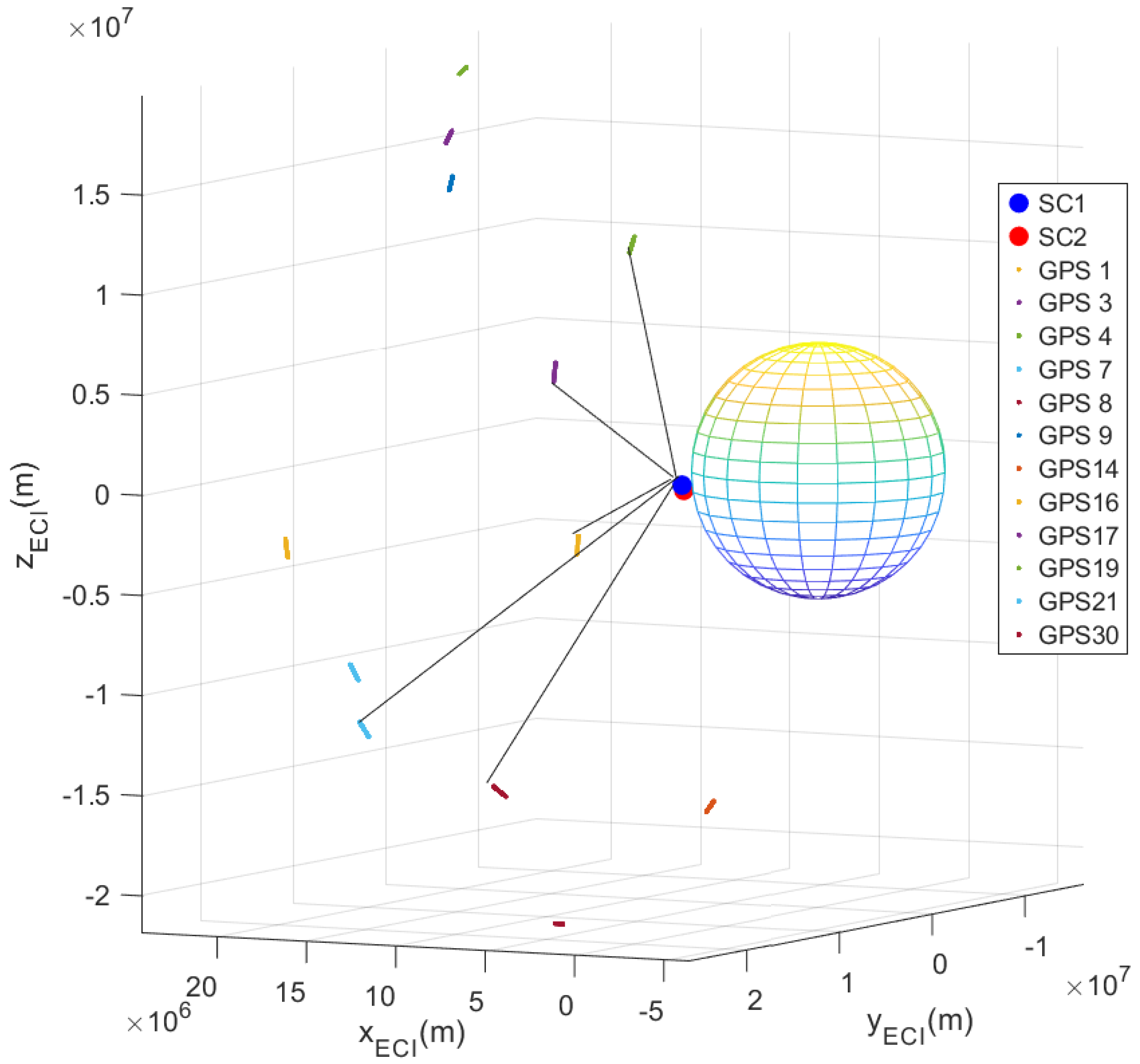 As the two SCs are in formation during the simulation, most of the time they use the same combination of GPSs, because they receive signals from the same GPS satellites and with similar geometry. Additionally, since they use the same model of GPS receiver, unmodeled instrumental errors are similar in both SCs, although not identical. On the other hand, in a real-world situation, the signal paths from the emitters to the receivers would also be similar for both SCs and therefore would experience similar perturbations.