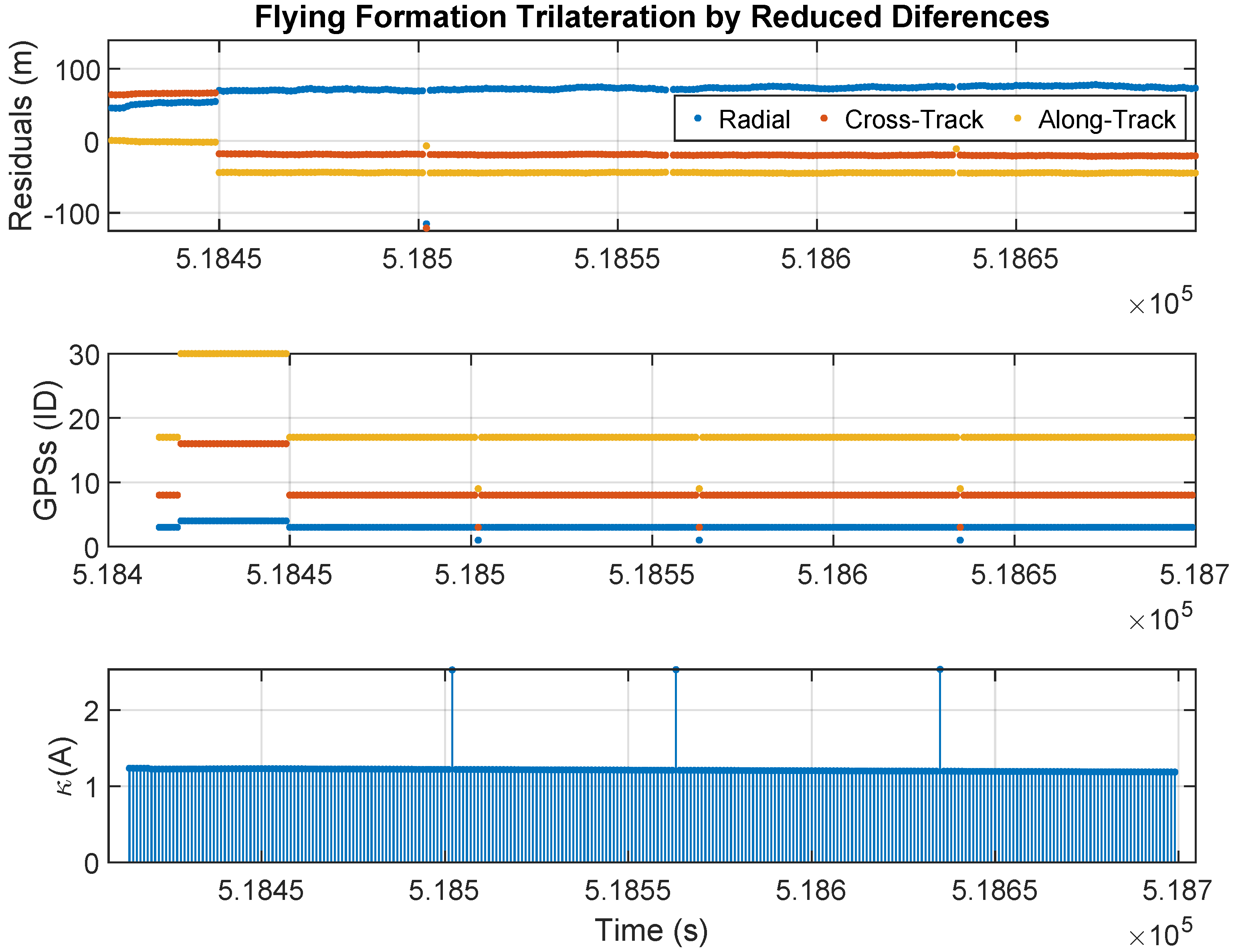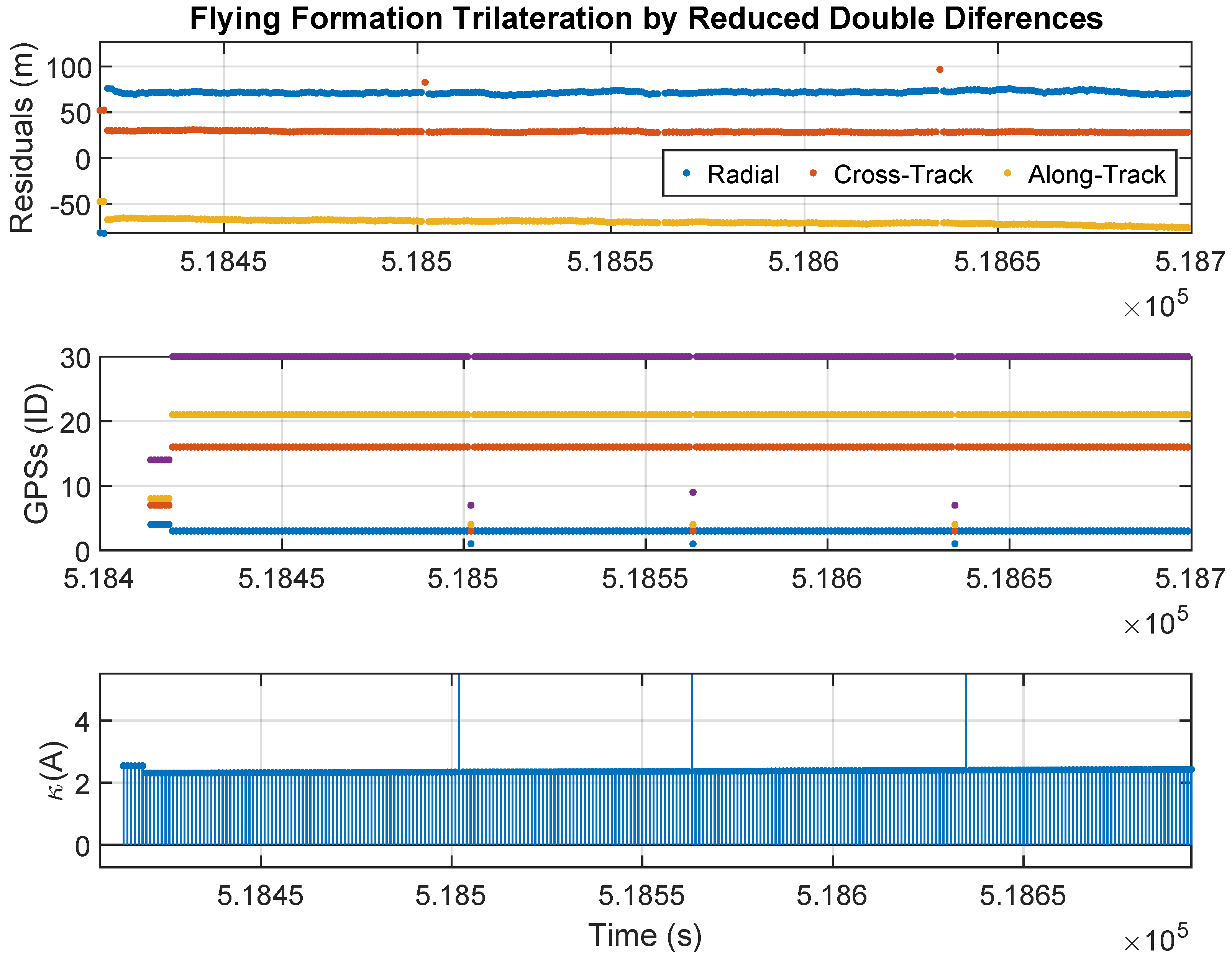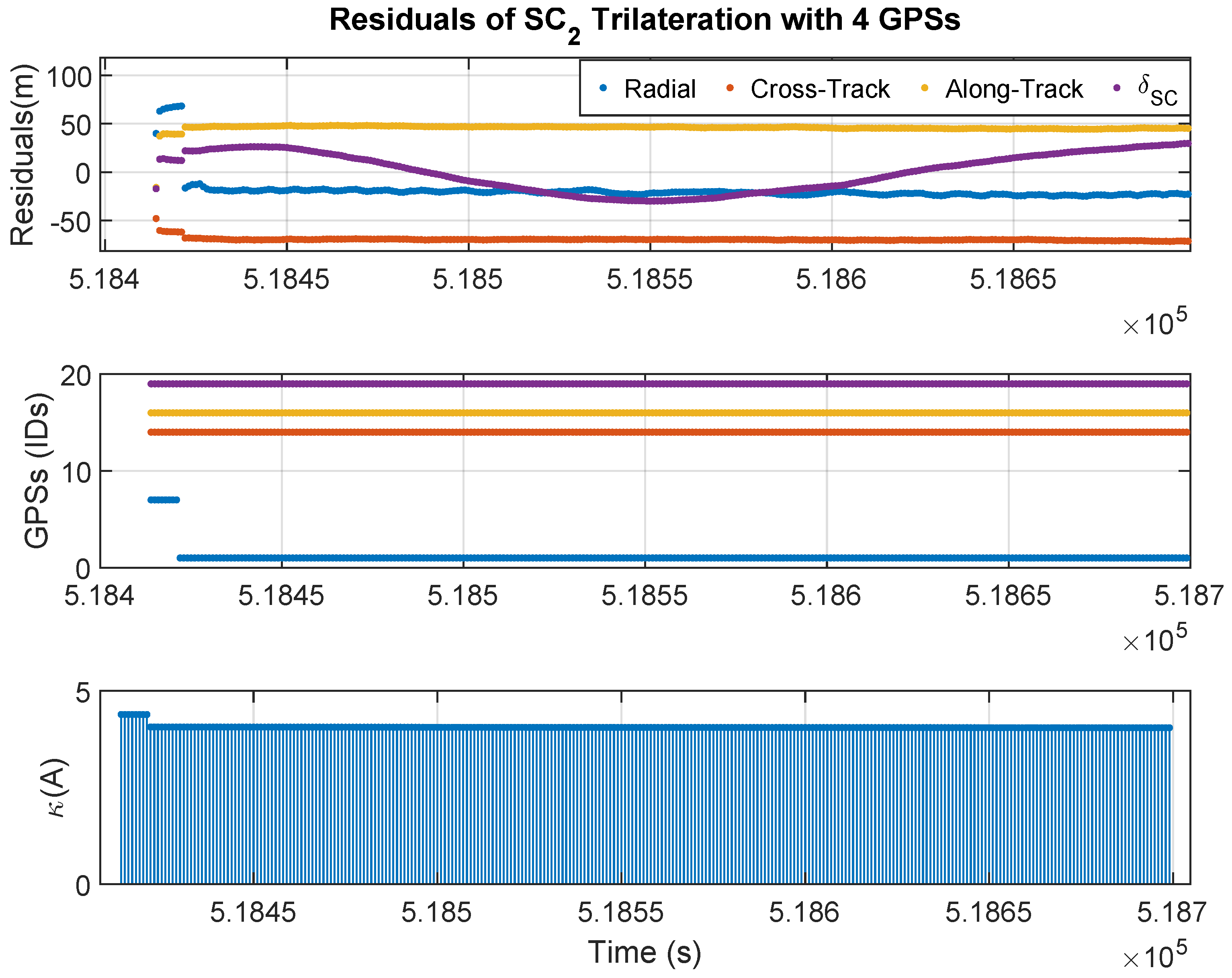 In Figure 5, the first graph shows the residuals of orbital positions (trilaterated minus propagated) in Radial, Along-Track, Across-Track axes and the local pseudorange error estimation, δ S C 1 . The second graph displays the identification numbers of the GPS transmitters used to construct the trilateration equation system. The third graph shows the condition number of the system matrix. It can be observed that the satellites used for trilateration change throughout the simulation, resulting in occasional losses of satellites. It can be observed that the residuals of the trilaterated position are extremely high, with errors of the order of kilometres. This is due to the high condition number of the system matrix, which is close to 500. As a result, the errors in the pseudorange measurements are amplified when the system is solved, leading to significant errors in the determined positions. These errors are also reflected in the estimate of the local pseudorange error.