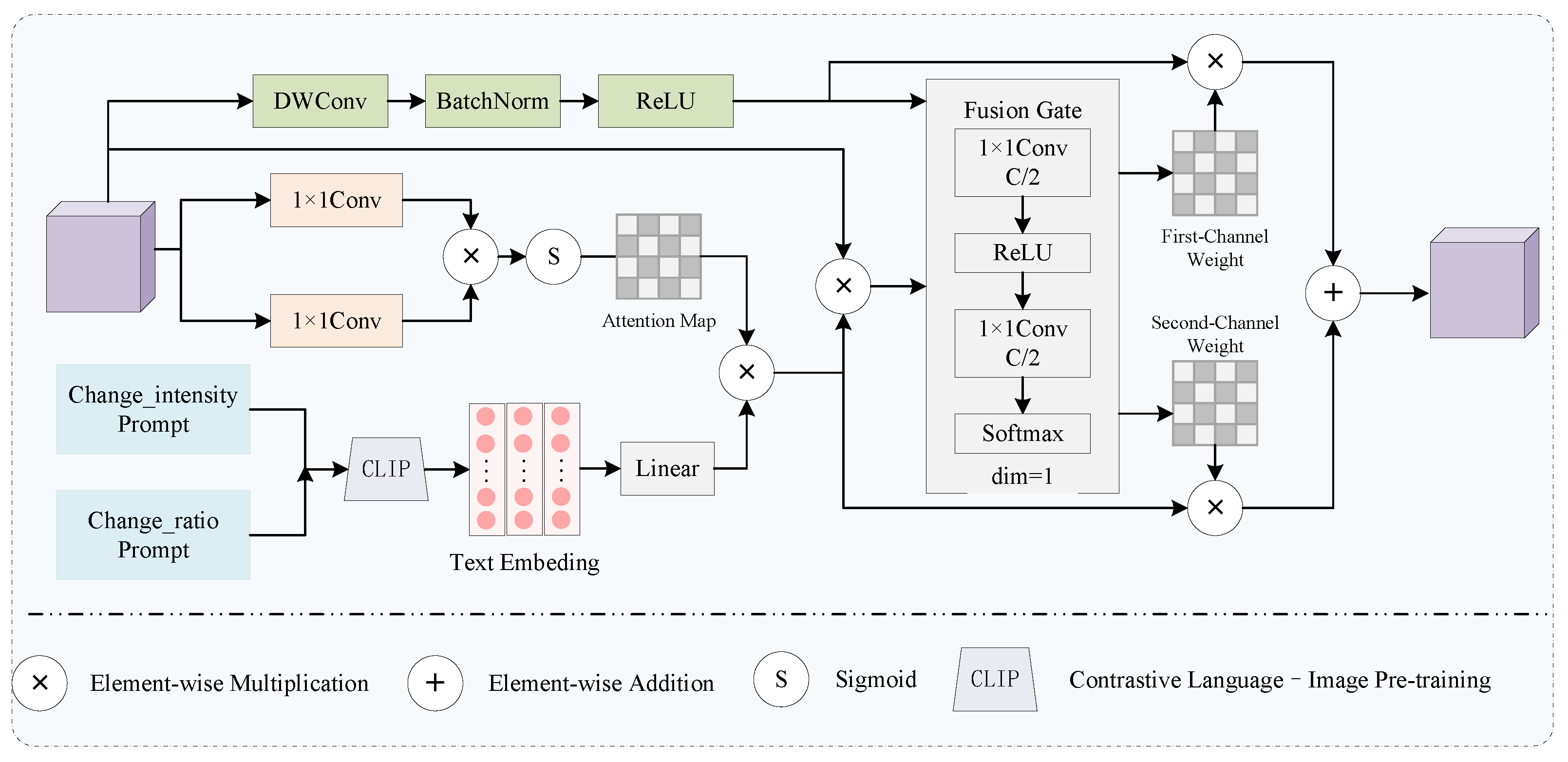 - Wang, T.; Bai, T.; Xu, C.; Zhang, E.; Liu, B.; Zhao, X.; Zhang, H. MDS-Net: An Image-Text Enhanced Multimodal Dual-Branch Siamese Network for Remote Sensing Change Detection. IEEE J. Sel. Top. Appl. Earth Obs. Remote Sens. 2025, 18, 12421–12438. [Google Scholar] [CrossRef]