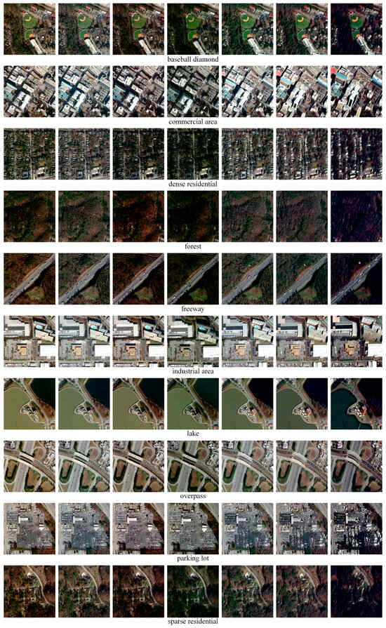 For each category, seven typical observation angles of the same scene area are presented as example images of the dataset in Figure 1. Different categories of scenes exhibit visual differences under various viewing angles, which can be categorized based on the prominence of geometric distortions, shadow variations, and the visibility of object sides. Specifically, these visual differences manifest through the extent of shadow area changes as off-nadir angle increases, the degree to which lateral surfaces of elevated structures become visible, and the level of occlusion and perspective distortion affecting ground objects. Scene categories with tall buildings, such as commercial areas and industrial areas, show greater visual differences across large and small off-nadir images. In these categories, large off-nadir angles produce substantially more pronounced shadow areas, expose multiple building facades that are invisible in nadir views, and introduce significant perspective foreshortening. These angular-dependent changes provide rich geometric cues but also increase classification difficulty due to appearance variability. In contrast, scene categories with simple combinations of ground objects having minimal height differences from surrounding objects or terrain, such as freeways, usually exhibit minimal visual differences across various off-nadir images.
