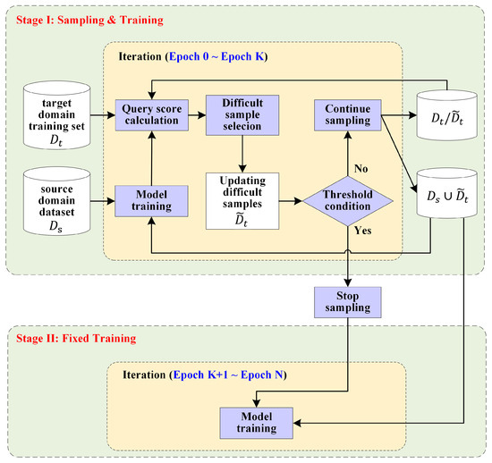 Angle-aware active domain adaptation (AADA) is performed for off-nadir satellite image scene classification with limited labeled data. As shown in Figure 2, model training consists of two stages: the first stage involves sample selection and training, whereas the second stage continues training after the training samples are fixed at the end of the first stage. The first stage of model training spans from epoch 0 to epoch K, whereas the second stage of model training spans from epoch K + 1 to the final epoch, where the sampling reaches the threshold condition at epoch K.