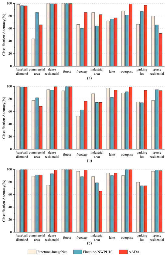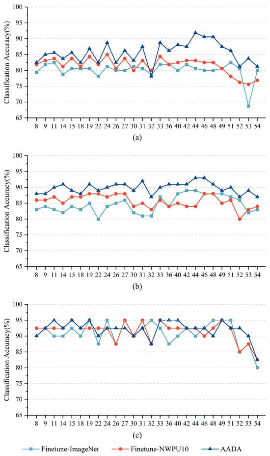 Three training modes were compared on the Off-nadir-Scene10 dataset. (i) Finetuned-ImageNet. This mode fine-tuned the ResNet50 model pre-trained on ImageNet with the Off-nadir-Scene10 dataset. (ii) Finetuned-NWPU10. This mode fine-tuned the ResNet50 model pre-trained on ImageNet and NWPU10 in sequence, with the Off-nadir-Scene10 dataset. (iii) AADA. This mode used the weights of the ResNet50 model pre-trained on ImageNet as the initial weights of the network, and trained with the NWPU-10 dataset as the source domain data and the Off-nadir-Scene10 dataset as the target domain data. The specific sampling setting during the training process was to fix the number of scene images sampled from the target domain at 1040, regardless of the amount of training data. The AADA method was trained not only with the input images re-sized to 256 × 256 pixels but also re-sized to 600 × 600 pixels, denoted as AADA-600. Furthermore, these training modes were compared against the advanced domain adaptation method, SDM [61], on the Off-nadir-Scene10 dataset.