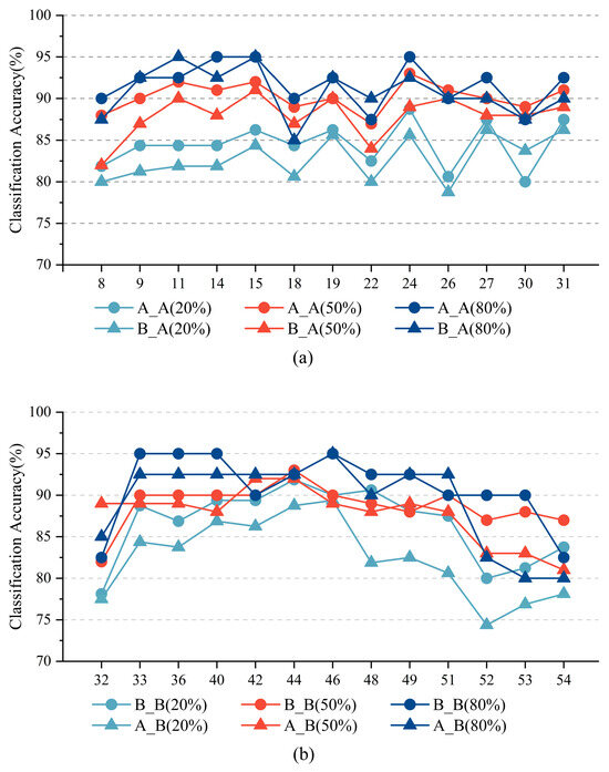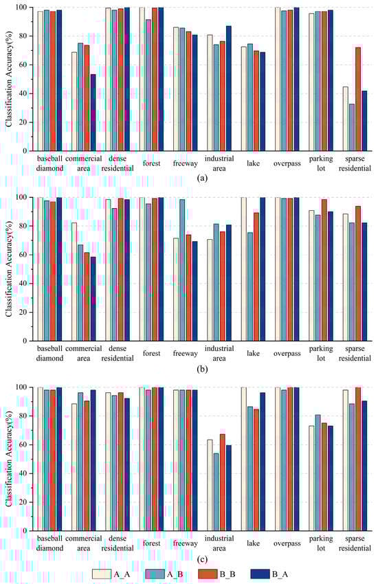 The Off-nadir-Scene10 dataset was divided into two groups based on the off-nadir angles: Group A with small off-nadir angles, and Group B with large off-nadir angles. The off-nadir IDs and specific angle information for these two groups are detailed in Table 3. According to the sources of the training and testing data groups, four experiments with different off-nadir angle modes were defined: A_A (training and testing images from Group A), A_B (training from Group A, testing from Group B), B_B (training and testing from Group B), and B_A (training from Group B, testing from Group A). Moreover, to obtain more comprehensive results, the target domain training data for these four modes of experiments were set at ratios of 20%, 50%, and 80%. Each experiment under these three training ratios was sampled 26 times, with 20 sampling rounds to ensure a consistent number of training images, i.e., 520 images.