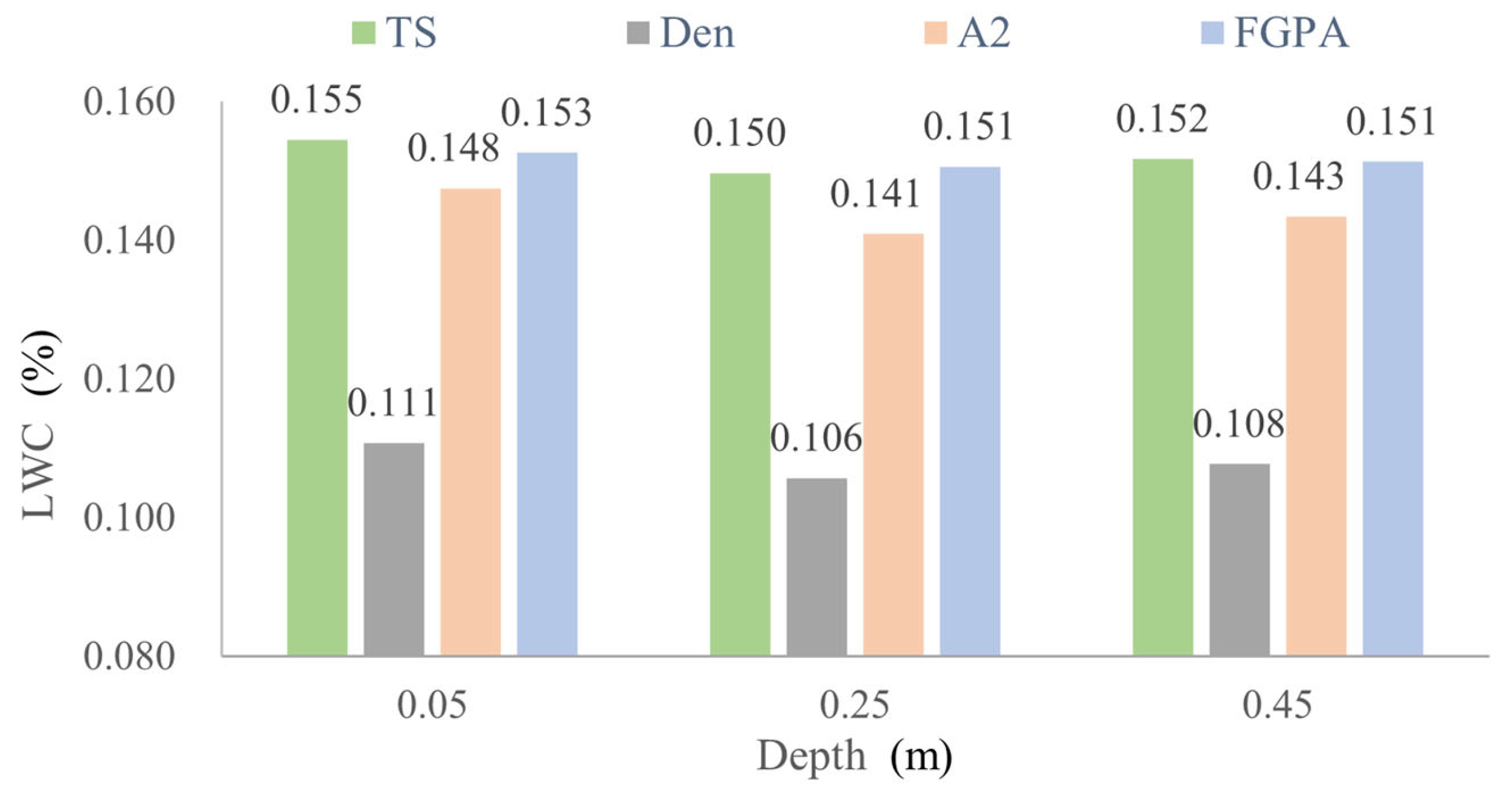 Figure 6. The results indicate that although the absolute values differ across models due to parameterization and underlying assumptions, all consistently identify three relatively dense snow layers, characteristic of partial melting and water saturation in a very wet snowpack. The LWC profile shows an initial decrease with depth followed by a slight increase (~2.3%), deviating from the common expectation that surface snow is wetter due to direct solar radiation. Among the models, the Den model yields systematically lower LWC values, while TS and FGPA are closely aligned, and A2 lies in between. The discrepancy across models ranges from 28% to 40%. Considering that TS and FGPA incorporate both dry and wet snow conditions, their averaged result are adopted as the representative LWC in this study.