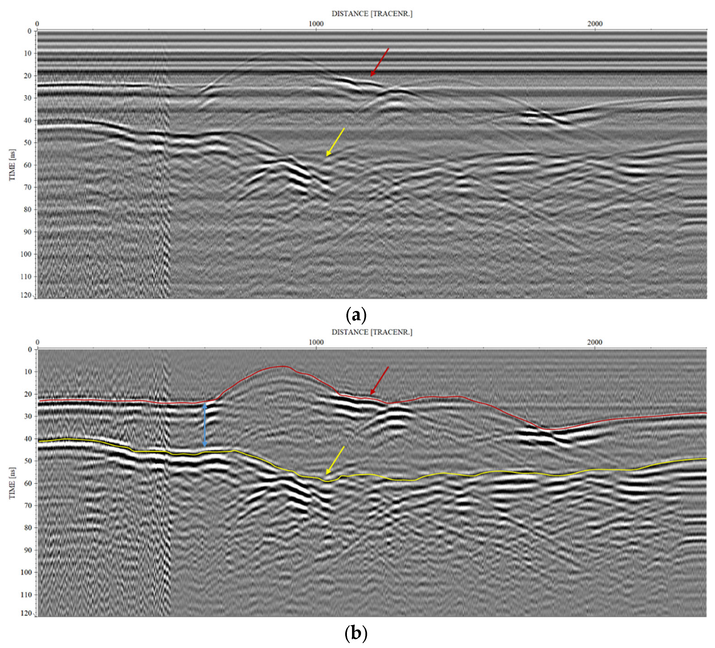 However, additional artifacts were observed: strong ringing effects induced by the UAV landing gear, which overlapped with and distorted the primary reflections, and noticeable diffraction patterns in the homogeneous shallow ground. To address these issues, the GPR dataset was processed using standard signal conditioning procedures, including de-wow filtering, time-varying gain correction, and background removal via mean trace subtraction. These steps effectively suppressed the ringing and diffraction artifacts, yielding a clearer representation of subsurface features, as illustrated in