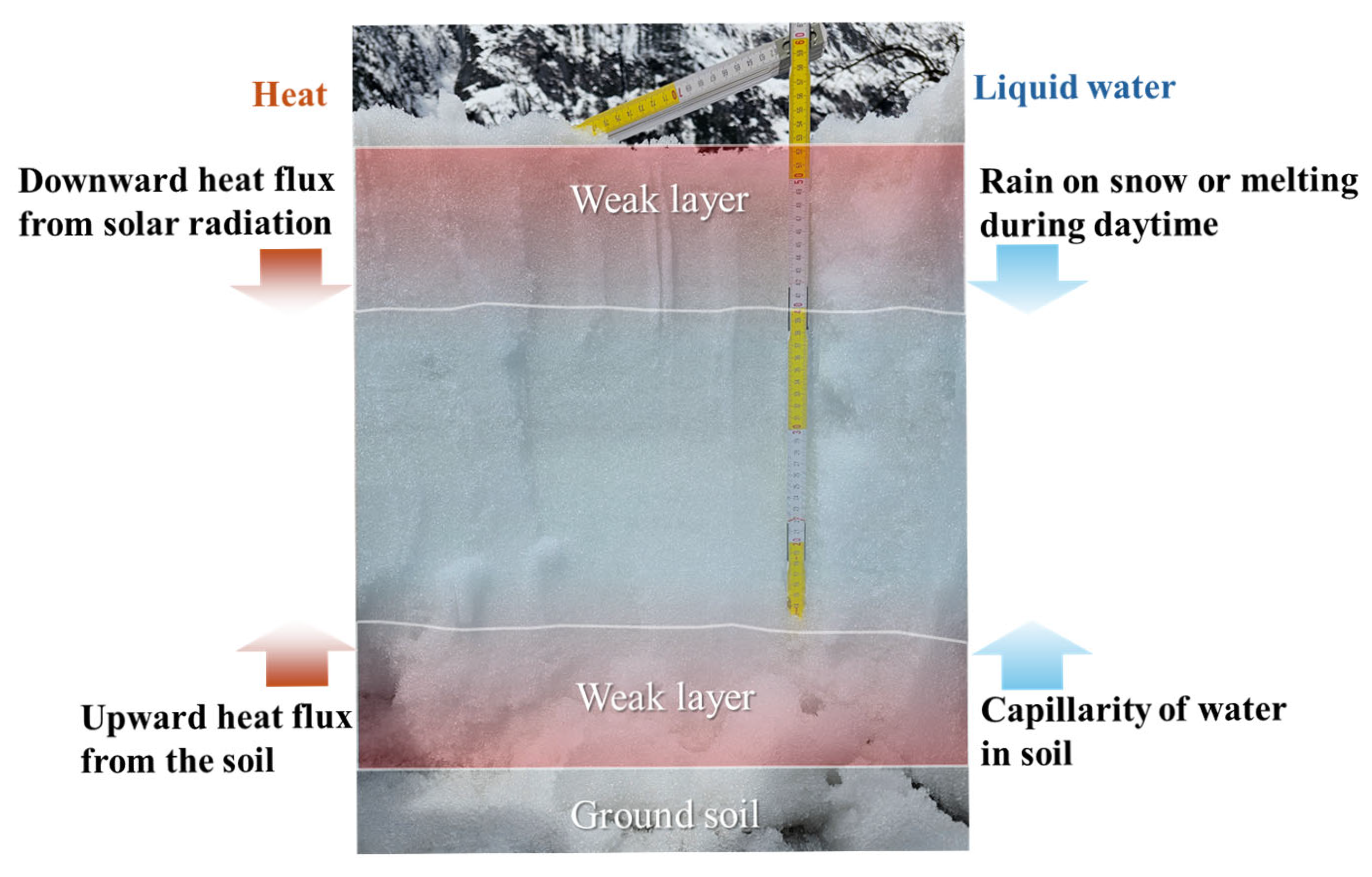 33]. These processes lead to highly stratified snowpacks with significant spatial and temporal variability. Temperature gradients promote the development of weak layers within the snowpack, while meltwater and rainfall infiltration further reduce bonding strength between layers. These conditions increase the likelihood of interlayer shear failure and contribute to snowpack instability [