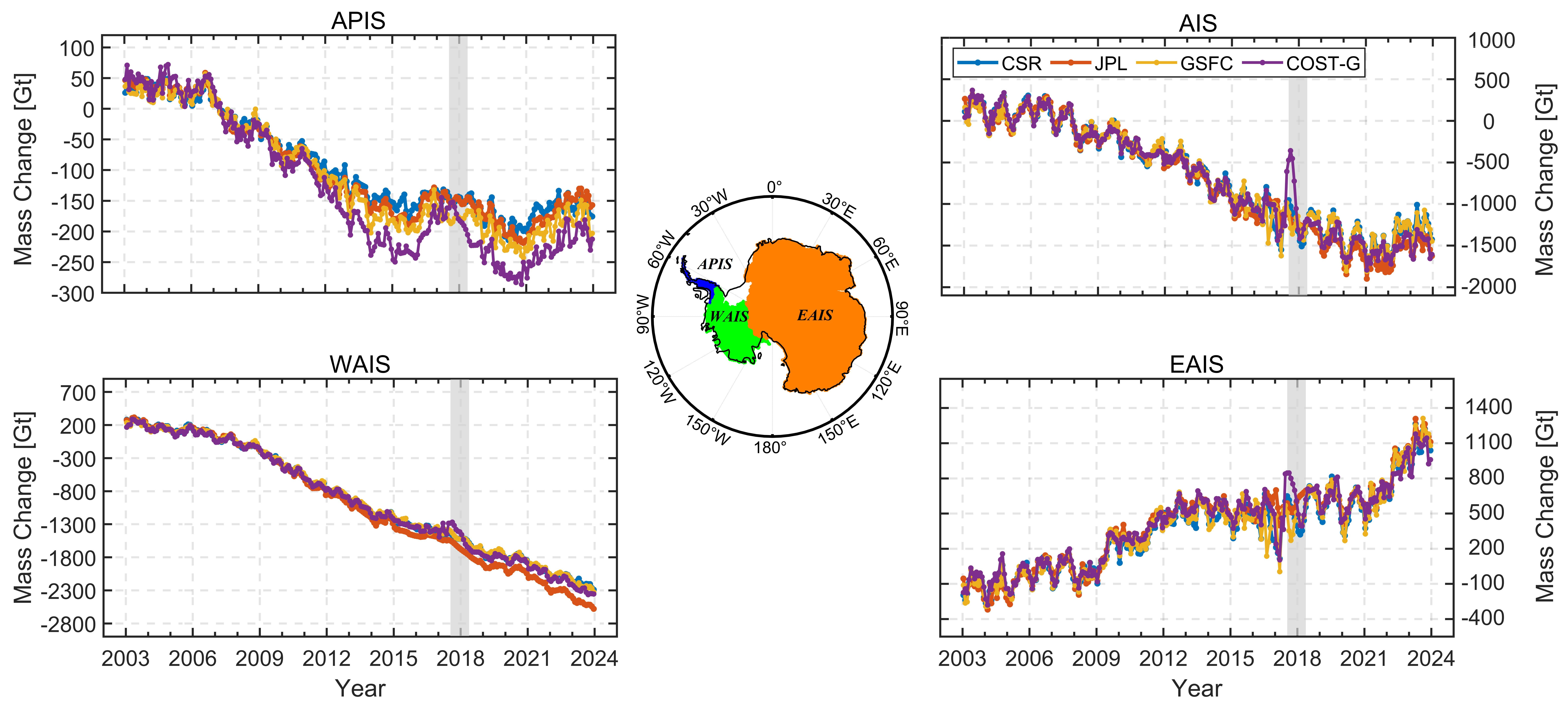 - One or more mascon or COST-G-based grids can be selected for application to perform further studies over the AIS. Caution should be taken when applying these grids over the APIS.