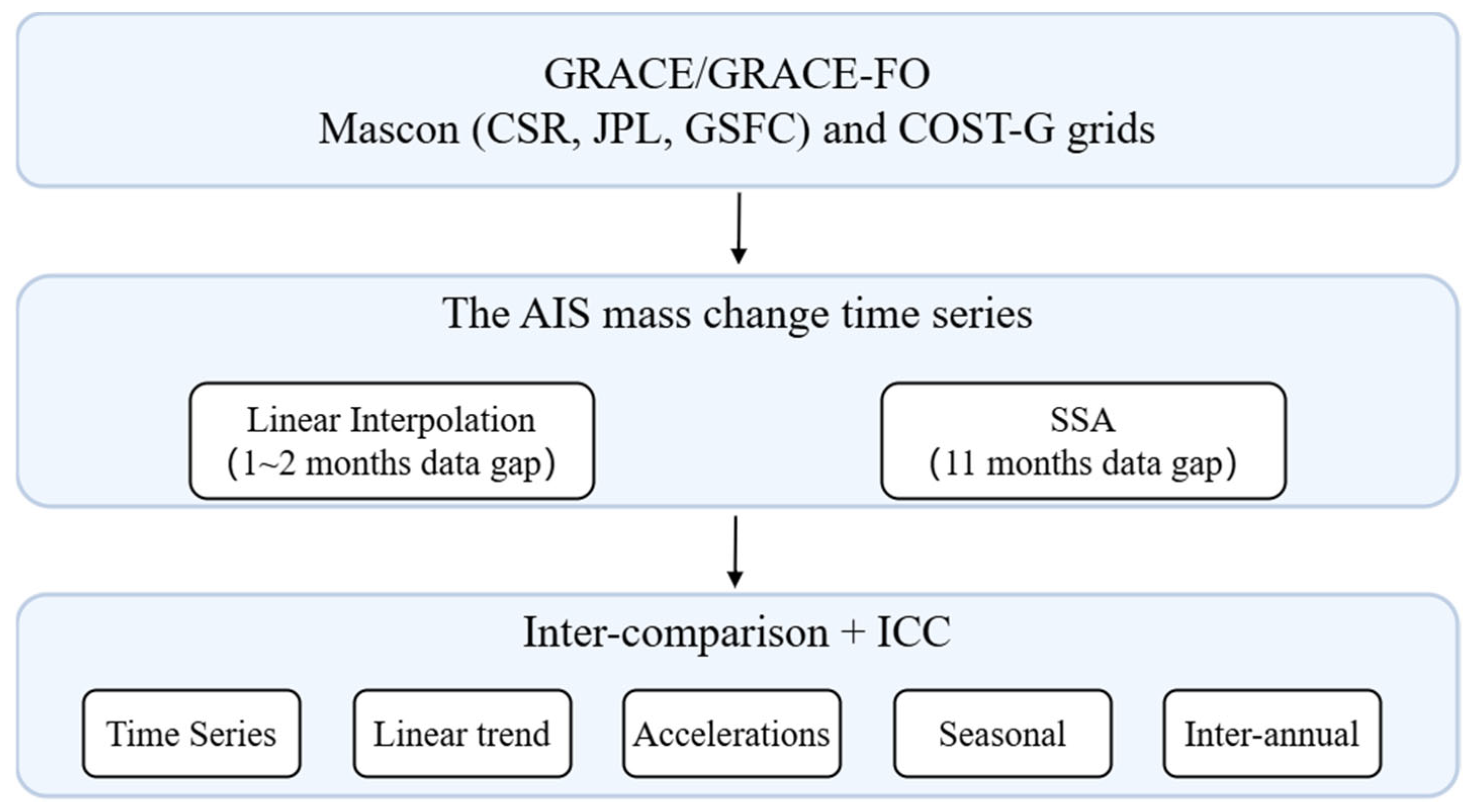 - Significant differences are shown among the annual mass changes of the AIS during the period of 2016–2017. When excluding annual mass changes during 2016–2017, the ICC values among annual mass variations derived from these four datasets increase significantly over the AIS, WAIS and EAIS, respectively. This indicates that mascon and COST-G-based grid data during the late stage of GRACE mission has an important impact on quantifying the consistency among these four gridded data. However, over the APIS, the ICC value slightly decline. This reflects that the consistency among these four datasets in the cases excluding the years 2016 and 2017 is no better than that in the case including the years 2016 and 2017.