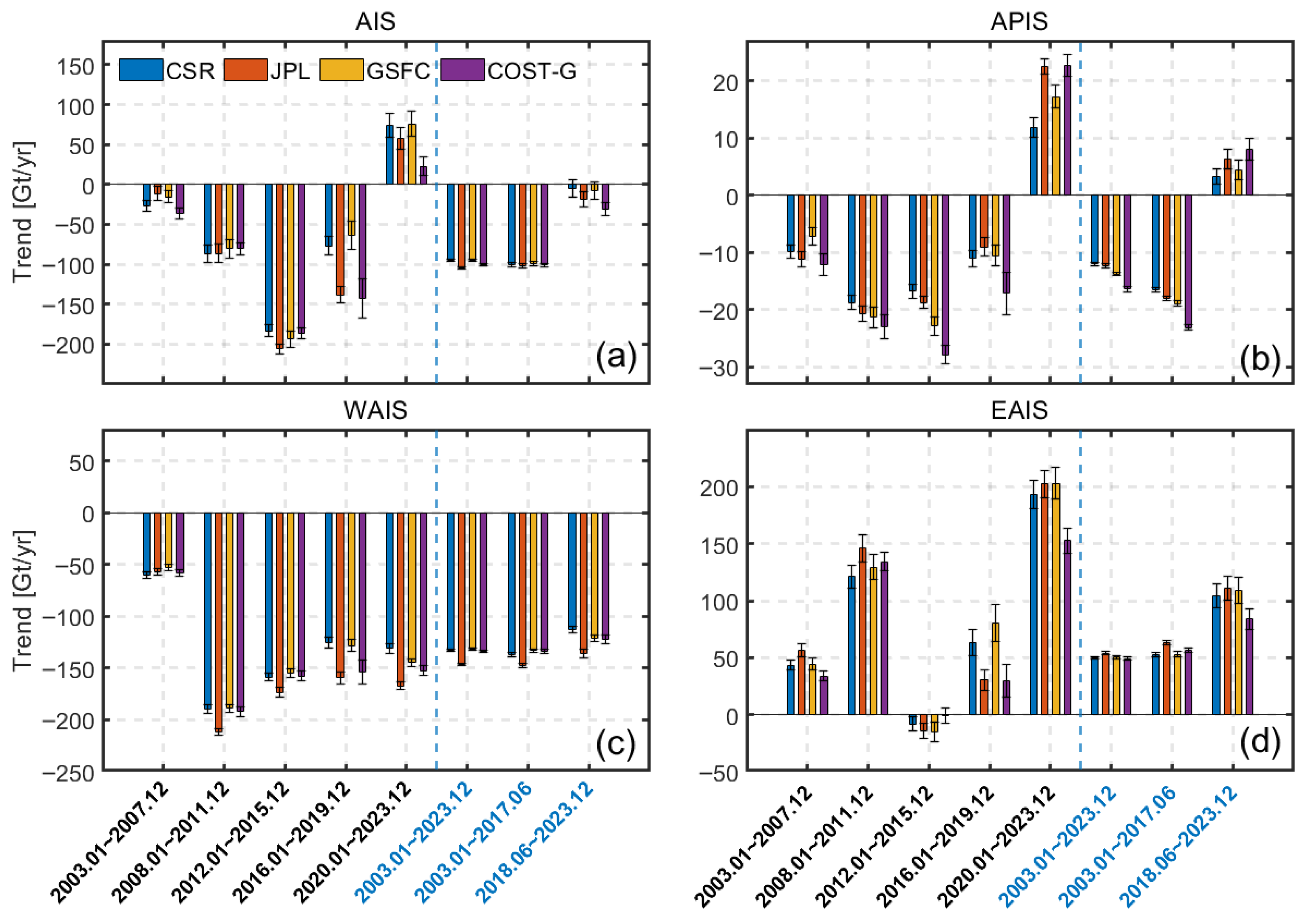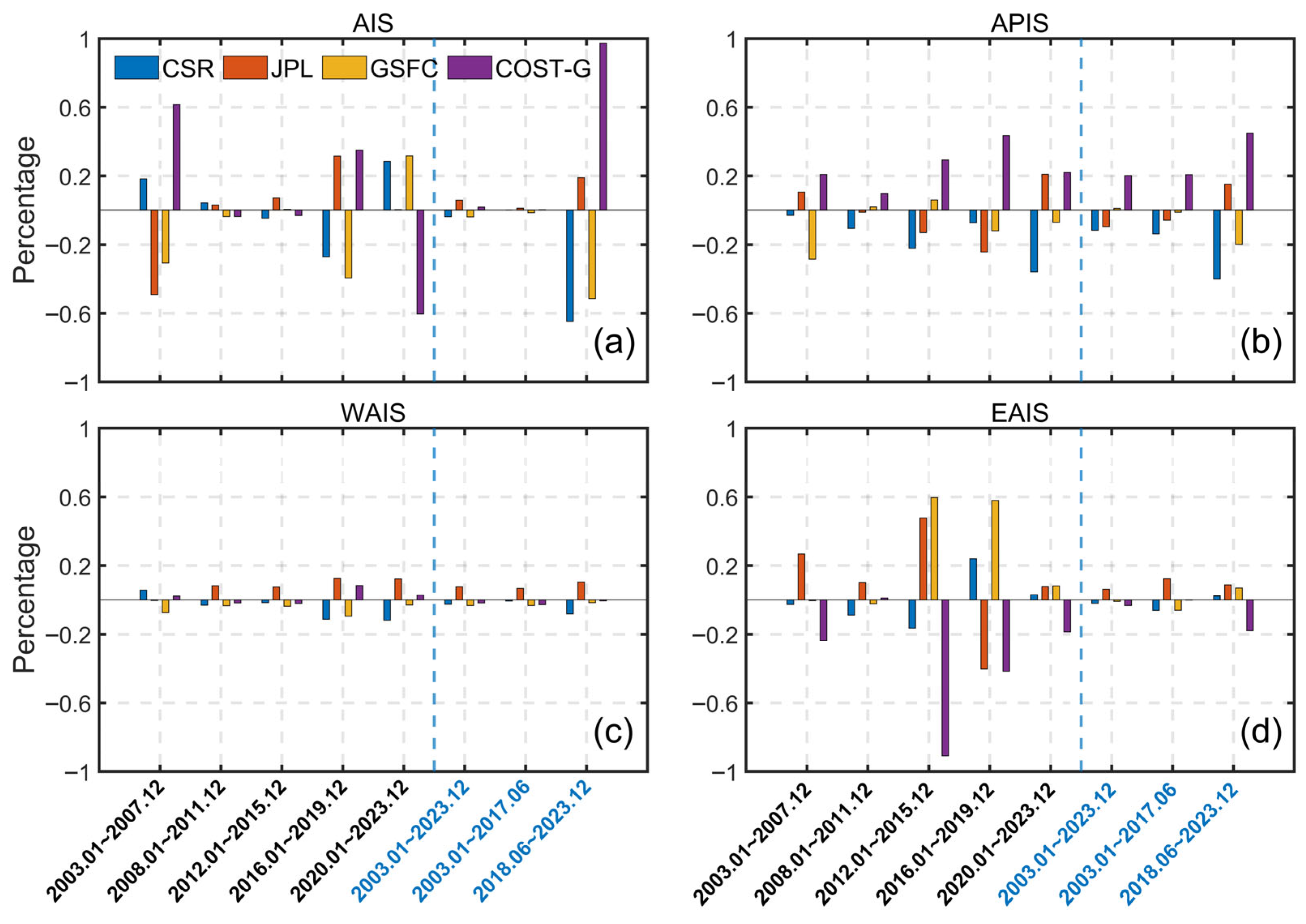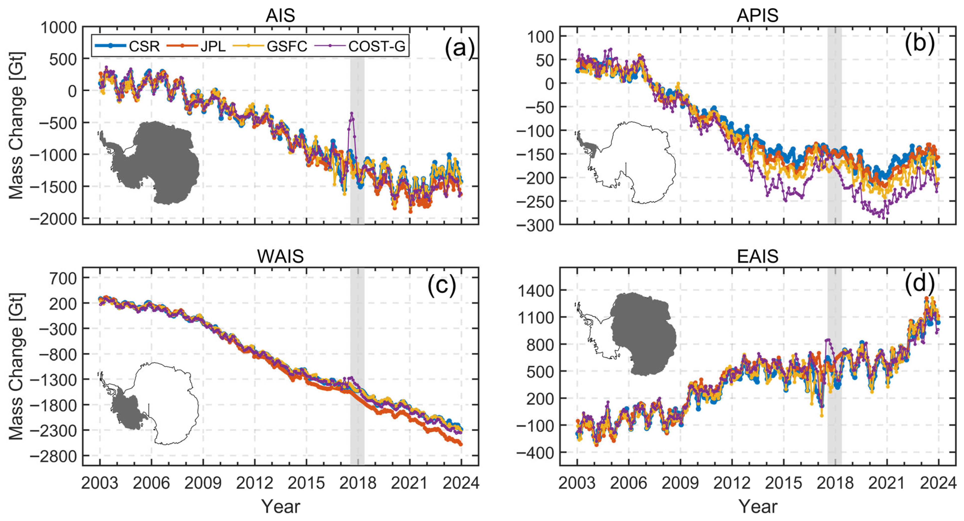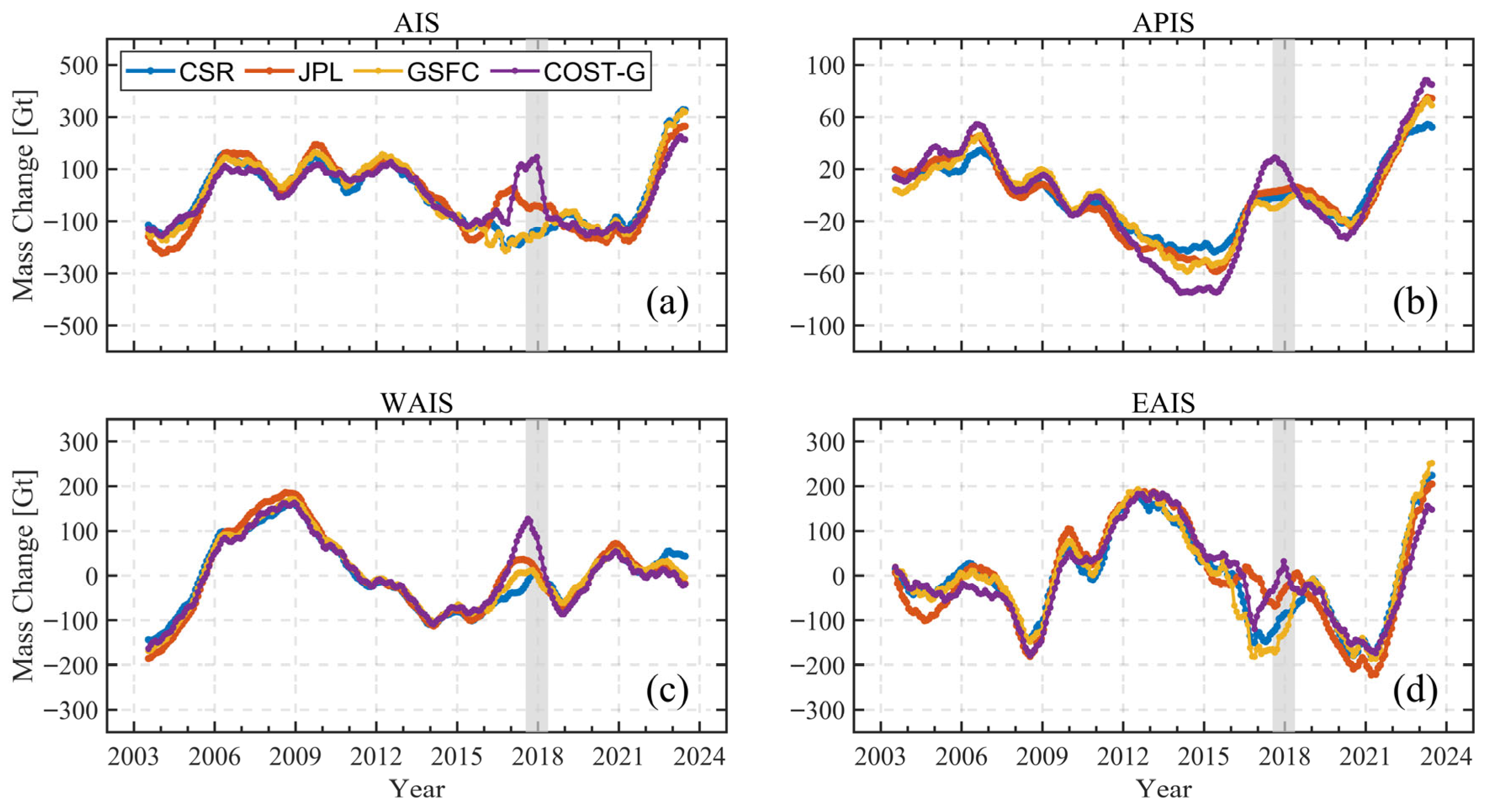 - A high degree of consistency is found among these four mass change time series derived separately from CSR, JPL, GSFC, and COST-G over the AIS and its subregions, with ICC values larger than 0.94. Such a consistency is reflected by the similarities shown at multiple temporal scales including the relatively long-term trend, monthly variation, annual variation and the interannual variations. Similar spatial patterns are also found among mass accelerations derived from the four GRACE/GRACE-FO grid products, i.e., the APIS and George V Land show a positive acceleration of approximately 3 Gt/yr2, while the ASE and Wilkes Land have a negative acceleration of approximately −4 Gt/yr2.