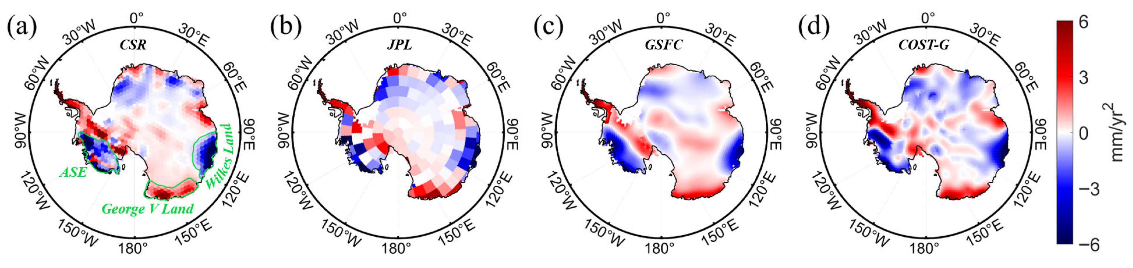 - Chen, J.L.; Wilson, C.R.; Li, J.; Zhang, Z. Reducing Leakage Error in GRACE-Observed Long-Term Ice Mass Change: A Case Study in West Antarctica. J. Geod. 2015, 89, 925–940. [Google Scholar] [CrossRef]