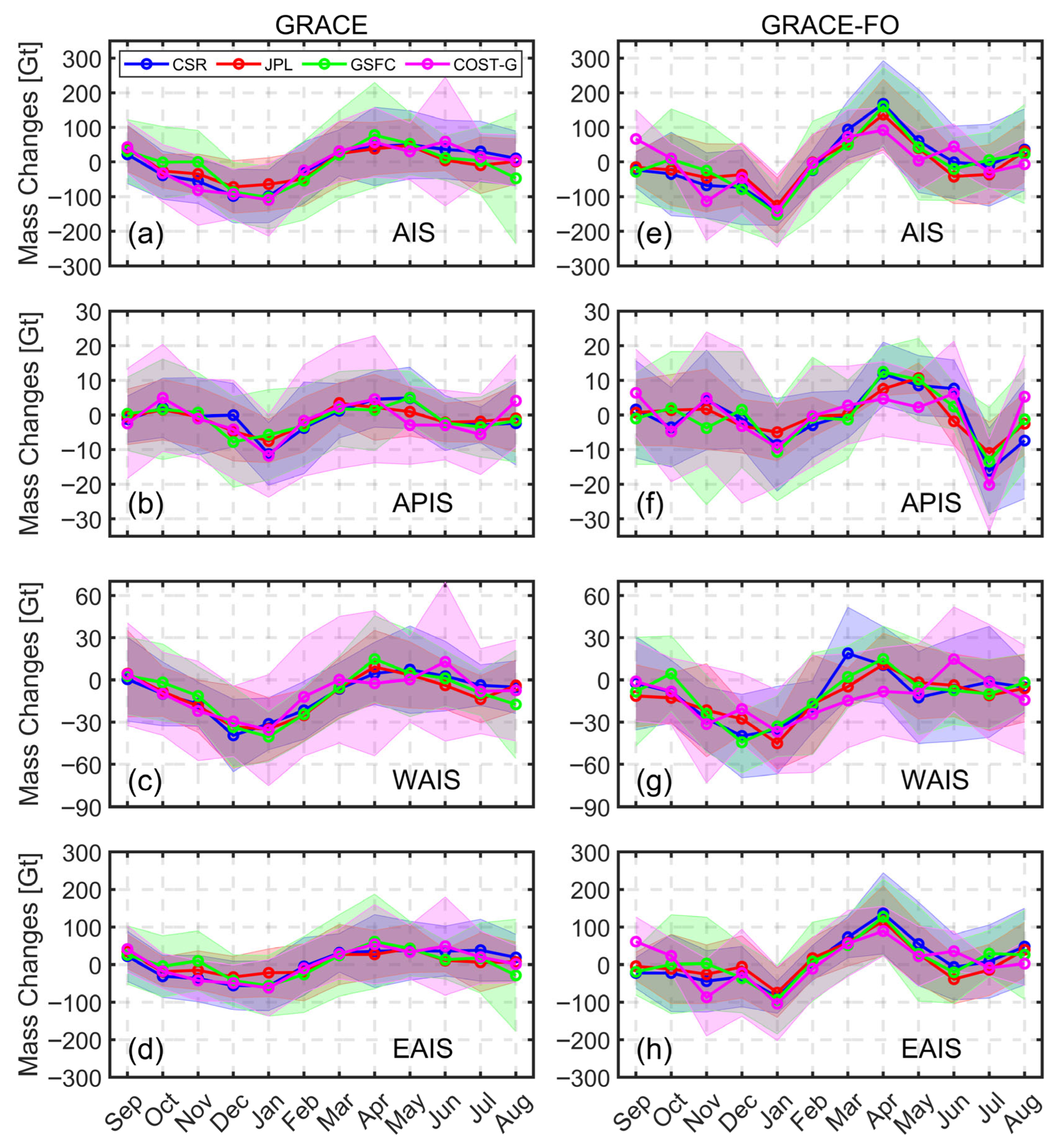 - From 2016 to 2018, the interannual signals from JPL mascon and COST-G-based grid products showed significant differences with those from CSR/GSFC mascon data over the AIS. The interannual signals of JPL mascon display the feature of “mass increasing first and later decreasing”, while the interannual signals from CSR/GSFC products show relatively stable mass variations. The above differences are mainly caused by discrepancies among interannual mass variations over the EAIS at the late stage of GRACE mission.