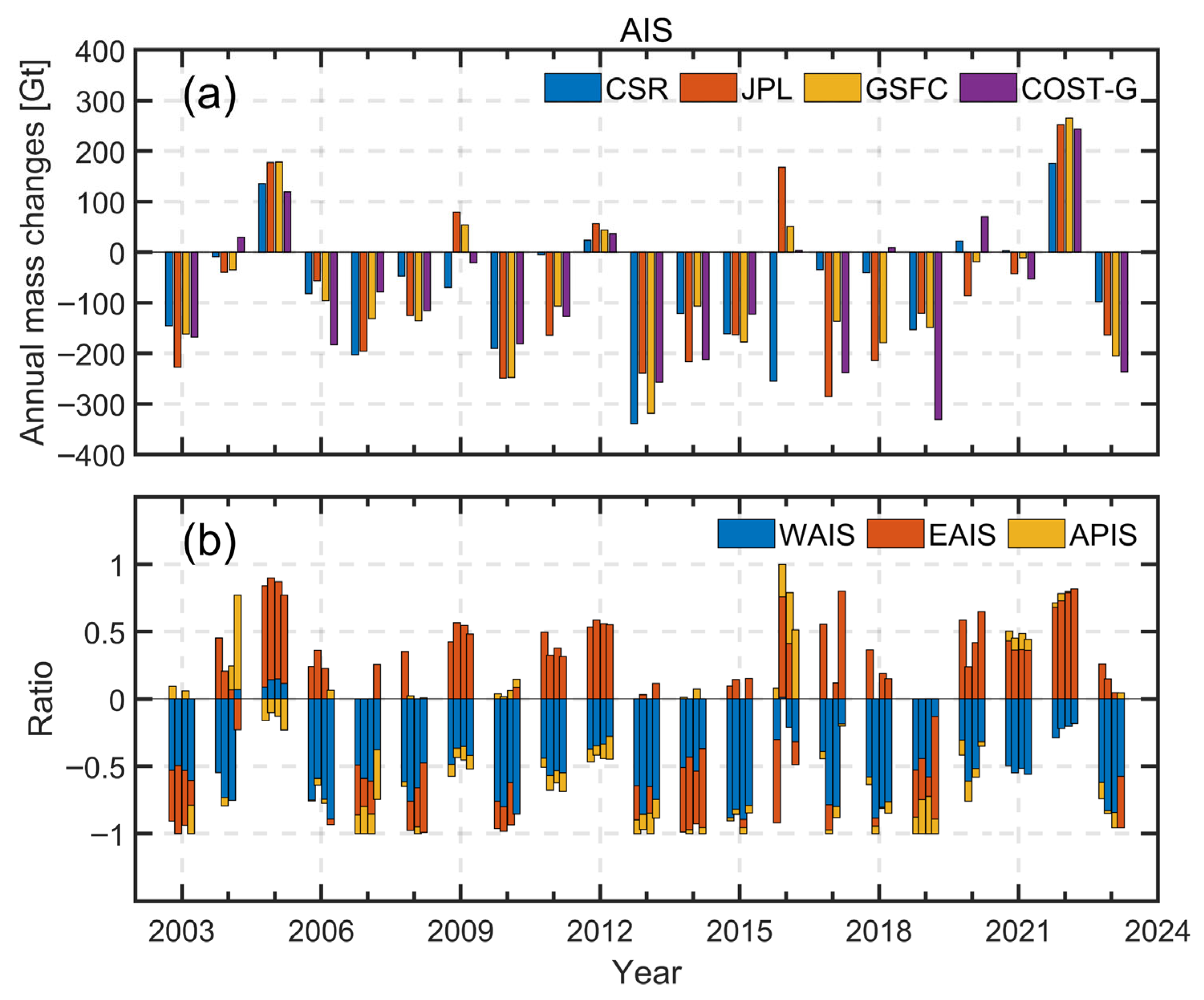 3.1. Mass Change Time Series of the AIS and Its Subregions