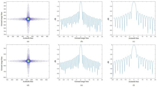 The azimuth and range profile of the strong scatter point: (a) Interpolated result for the strong scatter point 1; (b) Range profile for the point 1; (c) Azimuth profile for the point 1; (d) Interpolated result for the strong scatter point 2; (e) Range profile for the point 2; (f) Azimuth profile for the point 2.