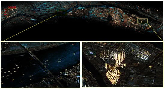 Figure 4 and Figure 5 respectively show the 1-m resolution non-alone-track imaging results of the HS-1 satellite for targets including power transmission lines and the Yangtze River. Furthermore, leveraging azimuth beam steering, HS-1 attained 0.5-m resolution in Sliding Spotlight mode; an example Sliding Spotlight image is presented in Figure 6. The following is an analysis of how VLEO SAR satellites, represented by HS-1, achieve high-resolution imaging advantages.