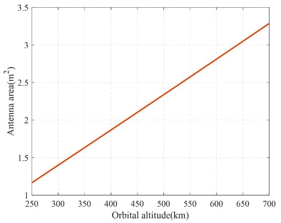 Assuming that the SAR operates in the X-band with a carrier frequency of 9.6 GHz and a far-end incidence angle of 45°, the relationship between the minimum area and the orbital altitude is shown in Figure 7.