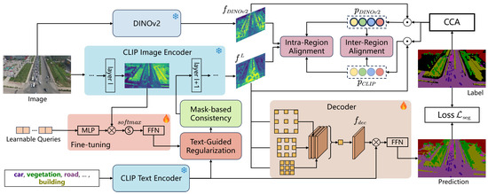 Open-vocabulary semantic segmentation (OVSS) extends beyond closed-set recognition by enabling segmentation for arbitrary categories through vision–language pretraining [16,17,42,43]. Compared with conventional semantic segmentation that is restricted to predefined label spaces, OVSS allows models to generalize to previously unseen or rare categories simply by providing textual prompts. This scalable capability is especially beneficial for real-world scenarios where object distributions are long-tailed or continuously evolving, making OVSS a promising and practical direction for open-world visual perception. With the success of large-scale vision–language models (VLMs) such as CLIP [12] and ALIGN [13], many approaches adapt image–text alignment to pixel-level tasks. Two-stage pipelines typically decouple region generation and semantic grounding. OpenSeg identifies class-agnostic proposals and links them to text embeddings [44]. ZegFormer [42] and ZSseg [14] follow similar strategies, while OVSeg [43] fine-tunes CLIP with region–text pairs. MaskCLIP [45] refines proposals using CLIP attention maps. Although effective, such approaches often depend on external mask generators trained with limited annotations, restricting generalization. One-stage methods directly predict masks from CLIP features. ZegCLIP [15] and SAN [17] leverage CLIP embeddings without requiring external proposal networks, while FC-CLIP [46] keeps the CLIP encoder frozen to preserve zero-shot capability. CAT-Seg [16] aggregates image–text similarities into a cost volume for robust fine-tuning. Despite these advances, existing OVSS approaches often inherit spatial ambiguity and coarse feature representations from their image-level pretraining, making it difficult to model complex scene distributions and recognize small-scale objects commonly found in UAV imagery. To address this, our method leverages the strong prior knowledge embedded in DINOv2 to enhance vision–language models in capturing complex scene distributions and fine-grained feature representations in UAV scenarios.