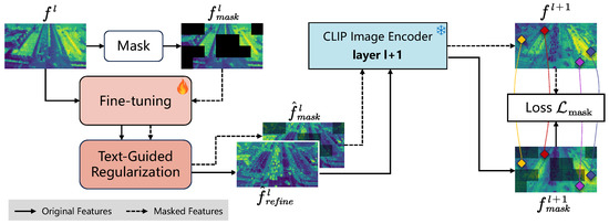 Subsequently, these features are refined through the fine-tuning module and the text-guided regularization module, and then propagated to the next layer of the CLIP visual encoder, producing two sets of features, and . A consistency constraint is then imposed between these two feature sets, applied only to the regions that remain unmasked in both: