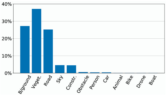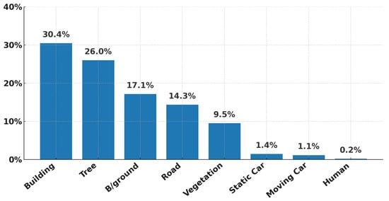The UAVid dataset [53] consists of 30 video sequences, from which 420 aerial frames are annotated at the pixel level. The dataset is split into 200 training, 70 validation, and 150 testing images, with resolutions of 3840 × 2160 or 4096 × 2160 pixels. It defines seven semantic classes, including buildings, roads, cars, trees, low vegetation, and pedestrians.