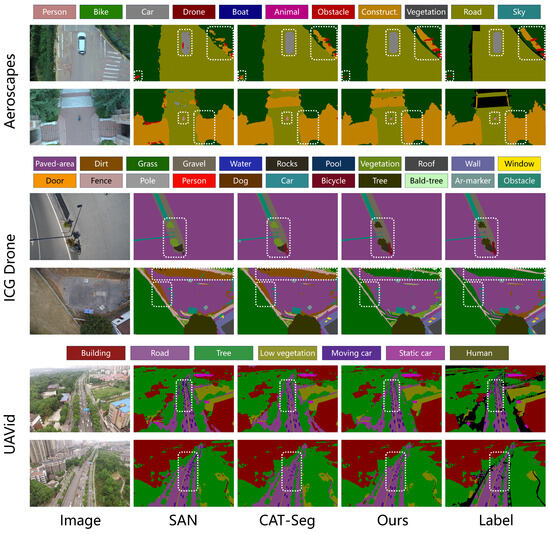 To further validate the effectiveness of the proposed method, we present detailed class-wise IoU comparisons against CAT-Seg with models trained on UDD5 and tested on Aeroscapes as shown in Table 3 and Figure 6. Our method achieves consistent improvements across nearly all categories. The most substantial gains appear in minority classes with extremely low pixel proportions, such as Drone (+9.8%), Obstacle (+8.0%), and Animal (+6.5%), all of which together account for less than 2% of the total pixels. These improvements indicate that HOSU effectively alleviates the long-tailed imbalance problem by enhancing recognition of small or infrequent objects rather than simply boosting performance on dominant classes. At the same time, for major categories such as Road, Vegetation, and Sky—which together make up over 85% of the dataset—our model still yields measurable gains (Road +1.0%, Vegetation +5.2%, Construction +2.8%), confirming that HOSU preserves accuracy on large, frequent categories while improving underrepresented ones. A similar trend is observed in the UAVid results (Table 4, Figure 7), where the dataset is dominated by large-area classes such as Building (30.4%) and Tree (26.0%), while rare categories like Static Car (1.4%) and Human (0.2%) are severely underrepresented. Our method achieves notable improvements on these scarce categories—Static Car (+3.2%) and Human (+3.9%)—demonstrating strong generalization to low-frequency instances. For common categories such as Building and Vegetation, HOSU still achieves notable performance gains, confirming its ability to maintain high accuracy on large, frequent categories while simultaneously improving recognition of underrepresented ones. These results demonstrate that our framework not only improves overall performance but also delivers more balanced gains across heterogeneous object categories—an essential property for UAV imagery, which is inherently affected by severe class imbalance.