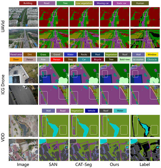 The recent emergence of vision–language models (VLMs) [12,13] has shifted semantic segmentation from a closed-vocabulary paradigm to open-vocabulary semantic segmentation (OVSS) [14,15,16,17]. Unlike traditional approaches that rely on task-specific label sets and require costly pixel-wise annotation for every new concept, OVSS enables models to segment arbitrary categories merely by providing textual descriptions. This flexibility allows perception systems to continuously expand their semantic understanding without retraining, making OVSS particularly powerful for real-world environments where novel or long-tail categories frequently emerge. A growing body of research has sought to exploit the zero-shot capabilities of VLMs for this purpose. For instance, SAN [17] introduces a lightweight side network to augment CLIP with mask proposals and attention-guided recognition, SED [18] designs a hierarchical encoder–decoder with early category rejection to improve both accuracy and efficiency, and DeOP [19] proposes a one-pass decoupled framework with patch severance and classification anchor learning to boost performance. Despite these advances, most VLMs are pretrained with image-level objectives, leading to ambiguous spatial localization [20,21] and the limited modeling of fine-grained structures. As a result, achieving pixel-level segmentation remains particularly challenging in open-world conditions characterized by complex scene distributions and the frequent presence of small-scale targets, especially when dealing with UAV imagery.