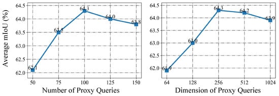 The right plot of Figure 12 examines the effect of query dimensionality. Increasing the dimension from 64 to 256 yields clear gains, with mIoU improving from 62.0 to 64.3 as higher-dimensional embeddings capture more discriminative details. Performance remains comparable at 512 (64.2) but drops at 1024 (63.9), indicating that excessively high-dimensional queries introduce redundancy and heighten the risk of overfitting, making the model overly sensitive to minor details.