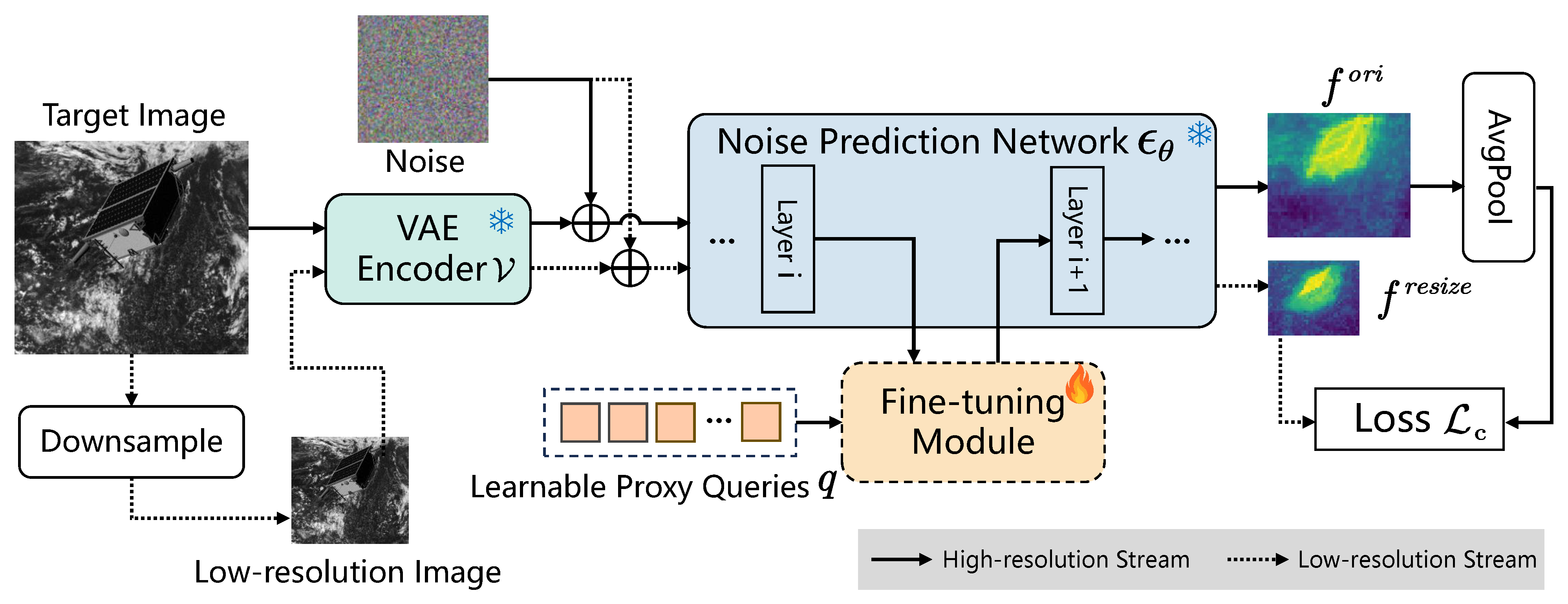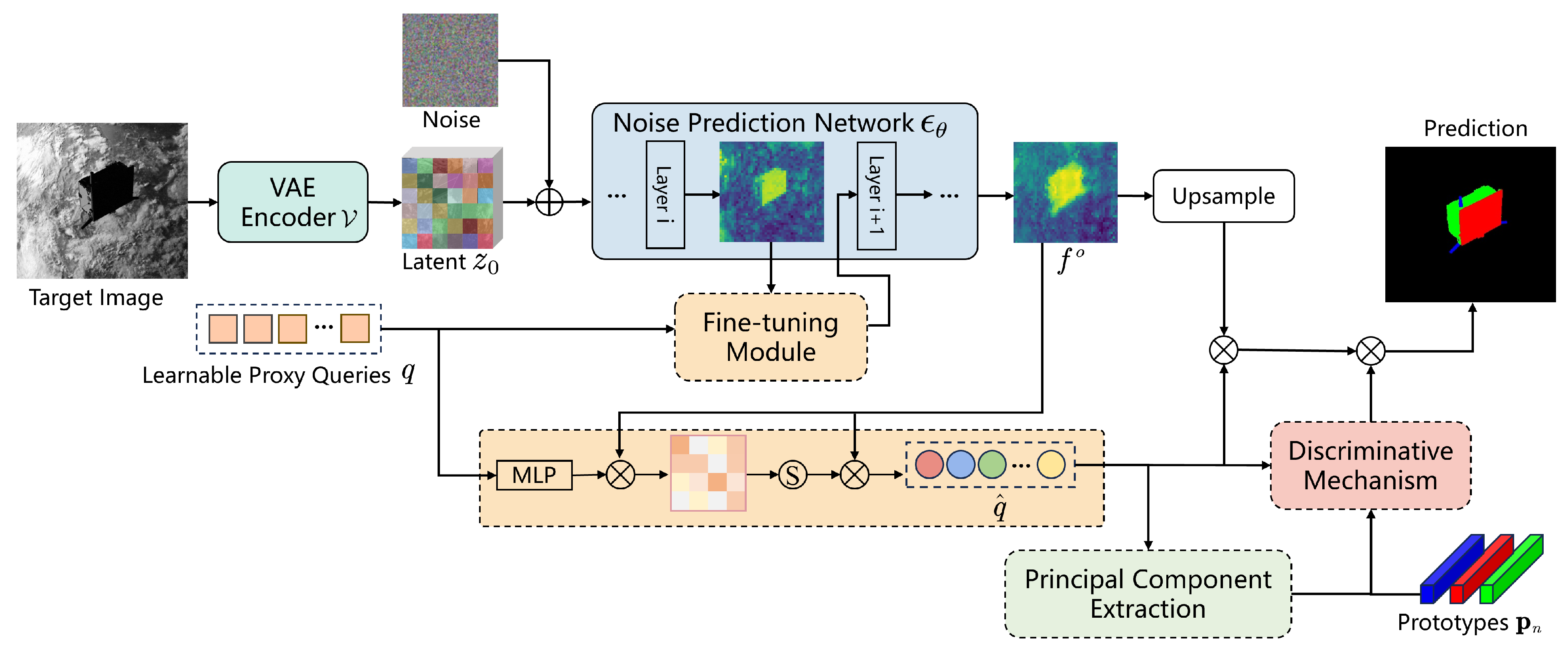 - We propose a novel diffusion-based framework for few-shot satellite segmentation, named DiffSatSeg, which employs a set of learnable proxy queries for parameter-efficient fine-tuning, retaining the rich priors of diffusion models while enabling flexible adaptation to diverse satellite structures.