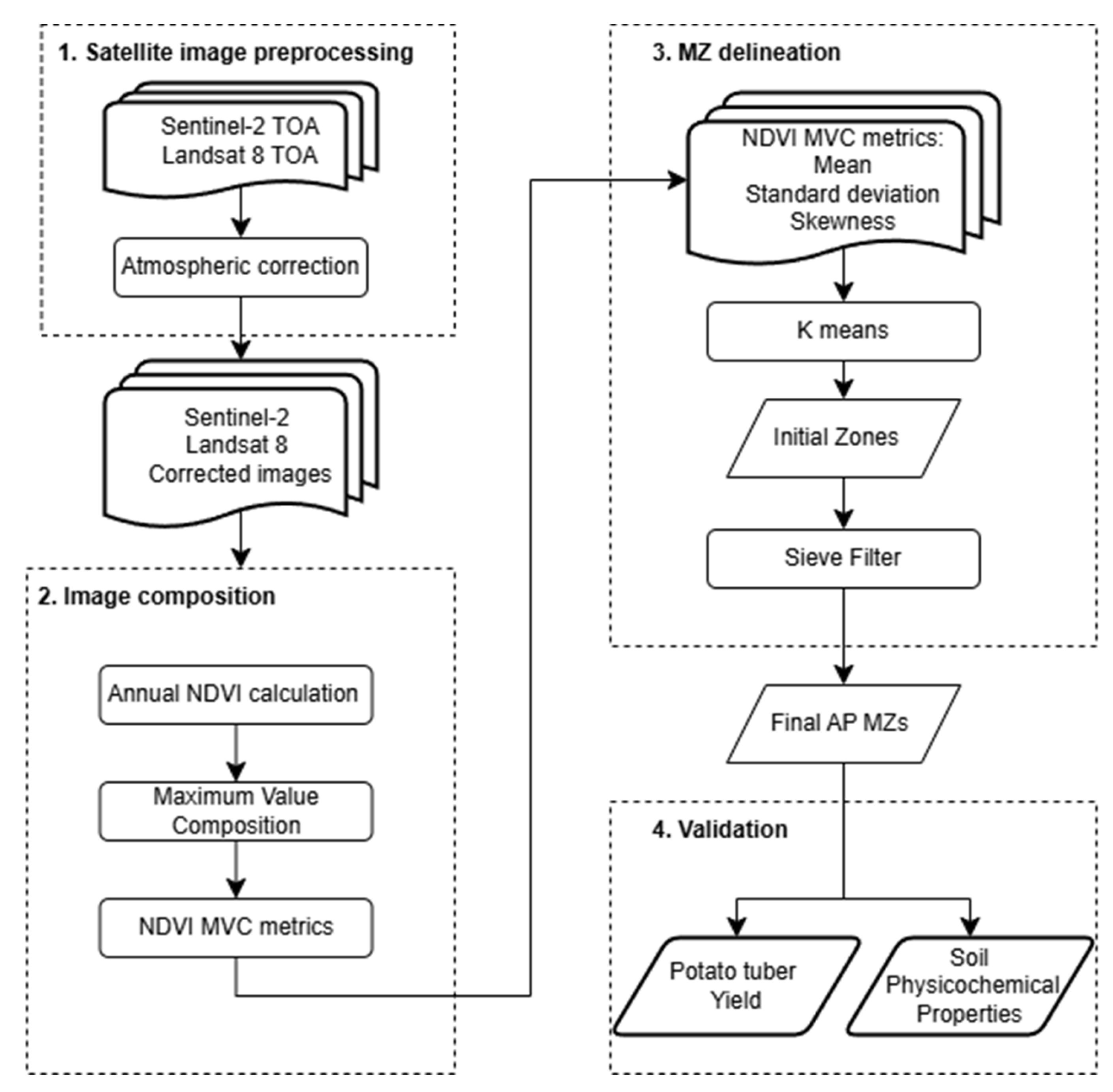 The objective of this study is to develop a methodology for delineating MZs based on the concept of AP for commercial potato fields using a multisource diachronic analysis of optical satellite images. An eight-year (2015–2023) NDVI time series of Sentinel-2 and Landsat 8 images were used across 17 fields, and the delineation results were validated using potato tuber yield data and the soil physicochemical properties obtained from soil sampling.