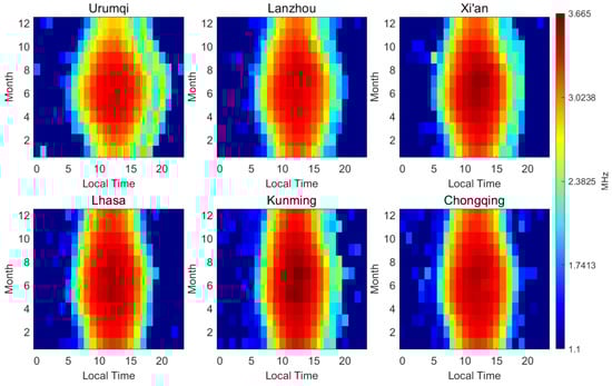 Diurnal Variation in foE at Six Ionosonde Stations Based on Local Time. (a) Urumqi diurnal foE value. (b) Lanzhou diurnal foE value. (c) Xi’an diurnal foE value. (d) Lahsa diurnal foE value. (e) Kunming diurnal foE value. (f) Chongqing diurnal foE value.