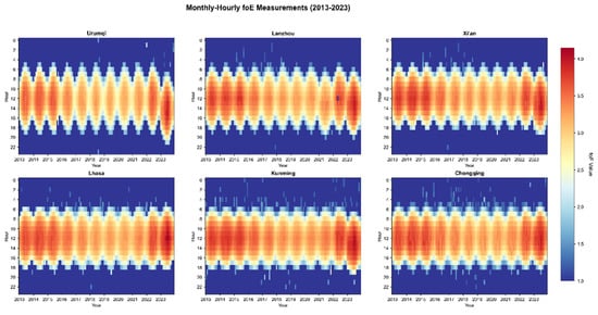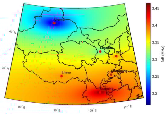The critical frequency of the ionospheric E layer (foE), obtained from ionograms, is a fundamental parameter measured by ionosondes and serves as a key indicator of the E-layer’s electron density and overall strength. In this section, we utilize foE data from six ionosonde stations—Urumqi, Lanzhou, Xi’an, Lhasa, Kunming, and Chongqing—operated within the Chinese ionospheric sounding network and located in and around the Tibetan Plateau, to perform a comprehensive analysis of the E-layer characteristics in this region. The analysis covers aspects including intensity, spatial distribution, diurnal and seasonal variations, as well as long-term trends. These results offer important insights into the spatiotemporal variability of the ionospheric E layer and enhance our understanding of the coupling mechanisms between the ionosphere and the lower atmosphere.
