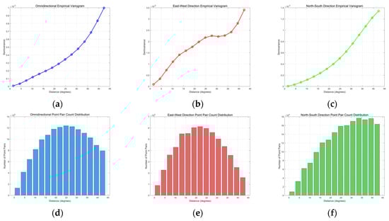 Variogram analysis of the foE interpolation network. (a) Omnidirectional empirical variogram. (b) Empirical variogram in the east−west direction. (c) Empirical variogram in the north−south direction. (d) Omnidirectional point pair count distribution. (e) Point pair count distribution in the east−west direction. (f) Point pair count distribution in the north−south direction.