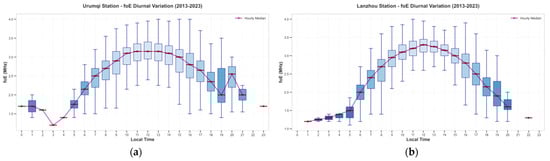 As shown in Figure 2, quantitative analysis reveals obvious spatiotemporal distribution patterns of the ionospheric E layer intensity over the Tibetan Plateau region. The foE values exhibit significant diurnal and seasonal variations, with the foE in the Tibetan Plateau region ranging from 1.1 to 3.665 MHz. The peak intensity consistently occurs at local noon. Five out of the six stations show the maximum value at 12:00 local time in July, while the peak at Urumqi is slightly later, appearing at 13:00 local time in June.
