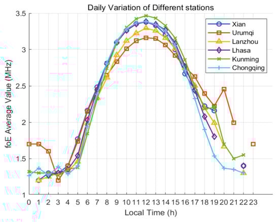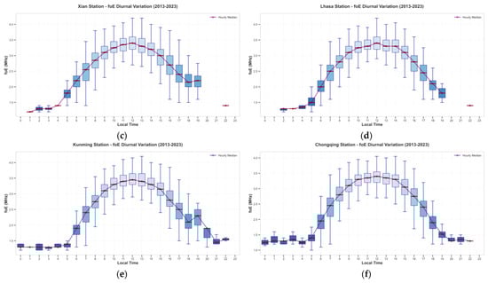 Figure 5 depicts the mean diurnal variation in foE at the six observation stations. All stations exhibit a typical pattern characterized by elevated foE values during daytime hours (09:00–17:00 LT) and reduced values at night (22:00–06:00 LT), reflecting the modulation of E-layer electron density by solar radiation. During daytime, the boxplots shift upward, indicating a significant increase in electron density driven by intensified solar ionization. In contrast, nighttime boxplots are confined to a lower frequency range (1.4–1.8 MHz) and exhibit a narrower distribution, suggesting weakened ionization and greater stability of foE at lower levels. The most substantial foE fluctuations generally occur around sunrise and sunset, coinciding with rapid changes in solar zenith angle. Notably, the magnitude of diurnal foE variations varies considerably across the stations. Higher-latitude stations show more pronounced fluctuations, as indicated by wider boxplot spreads, whereas lower-latitude stations display relatively stable patterns. Urumqi demonstrates the highest degree of diurnal variability, characterized by broad daytime spreads and significantly lower foE values at night. In contrast, Kunming exhibits the smallest amplitude of change and maintains relatively elevated nighttime foE levels. These spatial differences underscore the critical role of solar zenith angle variation in regulating E-layer intensity across latitudes. Figure 6 presents the corresponding average diurnal variation curves for foE at the six stations, which align closely with the boxplot patterns described above, further confirming the dominant influence of solar-driven ionization on diurnal E-layer behavior.