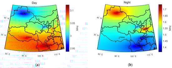 Spatial comparison of mean daytime and nighttime foE over the Tibetan Plateau region. (a) Daytime mean foE over the Tibetan Plateau region. (b) Nighttime mean foE over the Tibetan Plateau region.