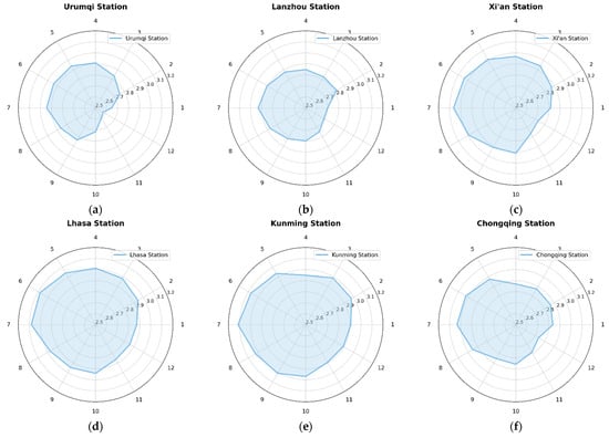 To further investigate the seasonal evolution of the ionospheric E layer over the Tibetan Plateau, Figure 8 and Figure 9 present radar charts illustrating the seasonal variations in the monthly mean foE values at six ionosonde stations: Urumqi, Lanzhou, Xi’an, Lhasa, Kunming, and Chongqing.