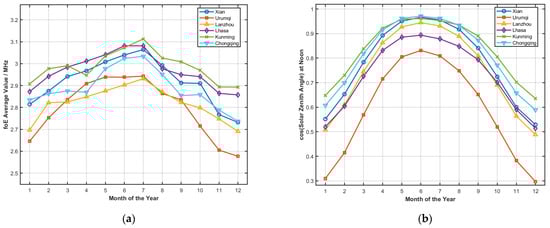 FoE over the Tibetan Plateau and the layout of cosine of the solar zenith angle. (a) Comparative monthly variation in mean foE at six ionosonde stations. (b) Monthly Average of cos(SZA) at Noon.