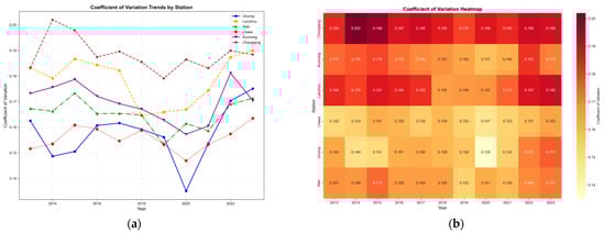 Data variation among different stations. (a) Six-station coefficient of variation temporal evolution. (b) Station-year coefficient of variation heatmap.