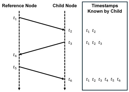 The platform in [] employs a two-way synchronization mechanism [], as shown in Figure 1. It is commonly assumed that the nodes can transmit and receive at the same time. The ultimate goal of time synchronization is to achieve consistency in both frequency f and phase c.