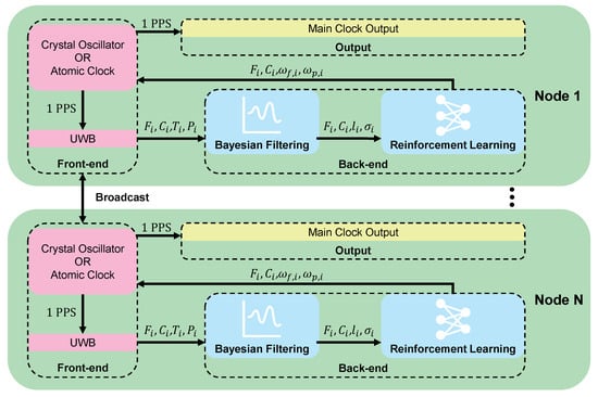 Building upon the platform presented in Pulsar [], to address the issues mentioned above, this paper proposes the DSTS architecture. This architecture is designed to achieve high-precision time synchronization for multi-sensor platforms, particularly in challenging and denied environments where GNSSs fail. The architecture consists of a front-end and a back-end. The front-end utilizes UWB sensor and various clock sources, such as chip-scale atomic clocks and crystal oscillators, to acquire local clock data and measurements of frequency and time differences relative to neighboring nodes. The back-end then employs Bayesian filtering to perform real-time optimization of the Time of Flight in communications with these neighbors, thereby reducing the impact of communication errors on time synchronization. Concurrently, using the DDPG algorithm [] to optimize network communication protocols, the architecture dynamically adjusts the synchronization weights assigned to different neighboring nodes. This optimizes synchronization accuracy when dealing with heterogeneous clock inputs and enhances the overall robustness of the time synchronization architecture.
