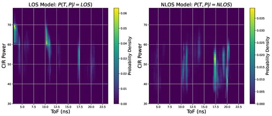 The other critical component of the filtering algorithm is the observation model. This model defines the probability of obtaining a specific observation given the current true state . To construct this model, we analyzed the statistical characteristics of observations under different propagation path states (LOS/NLOS) using a large set of prior experimental data []. We first built empirical frequency histograms and then converted them into conditional probability density functions using a non-parametric kernel density estimation method.