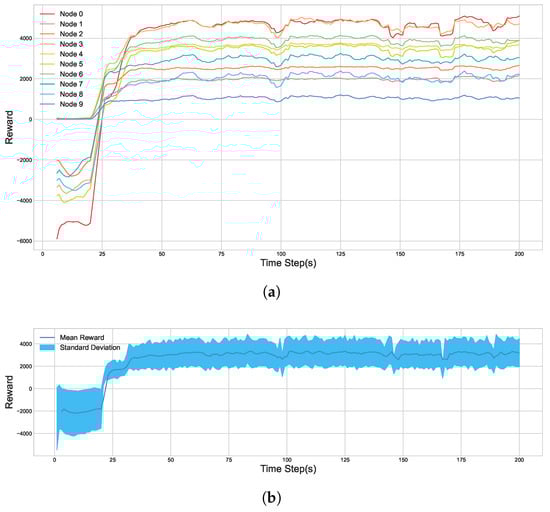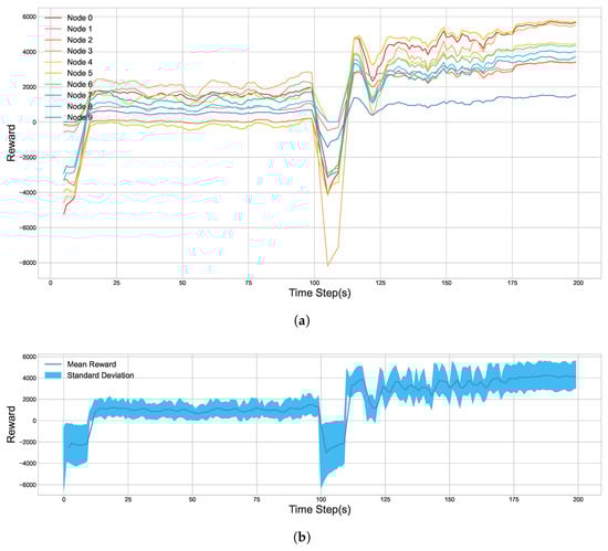 As illustrated in Figure 9, the cumulative reward for each of the 10 agent nodes shows significant growth over the course of the training process. The plot indicates that the entire system converges to a stable and high level of reward after approximately 75 episodes. This demonstrates that all agents successfully learned an effective policy to maximize the multi-objective composite reward function that we designed.