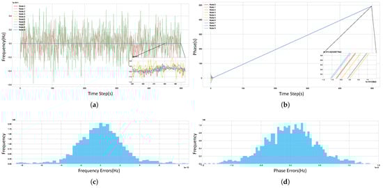 Time Synchronization Performance of the Algorithm. (a) Frequency synchronization across the system during the final episode. (b) Phase synchronization across the system during the final episode. (c) A histogram of the frequency differences for each node relative to the system’s average frequency over the last 300 time steps, excluding anomalous nodes. (d) A histogram of the phase differences for each node relative to the system’s average phase over the last 300 time steps, excluding anomalous nodes.