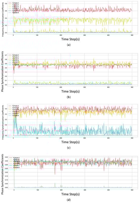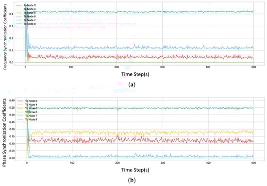 As shown in Figure 10, after the training converged, the frequency synchronization accuracy among the network nodes reached , and the phase synchronization accuracy reached s, excluding the nodes that were identified as having poor performance. This indicates that the proposed DDPG algorithm can effectively address the challenge of clock heterogeneity and achieve high-precision distributed time synchronization.