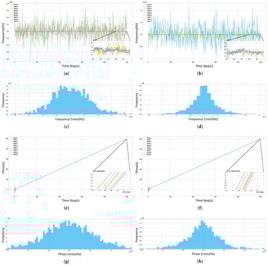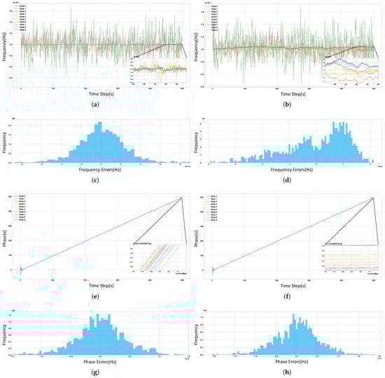 Time synchronization performance of the algorithm. (a) Frequency synchronization (DSTS); (b) frequency synchronization (AC). (c) Histogram of node frequency differences vs. system average (last 300 time steps, DSTS, excluding anomalous nodes); (d) the same as (c) (AC). (e) Phase synchronization (DSTS); (f) phase synchronization (AC). (g) Histogram of node phase differences vs. system average (last 300 time steps, DSTS, excluding anomalous nodes); (h) the same as (g) (AC).
