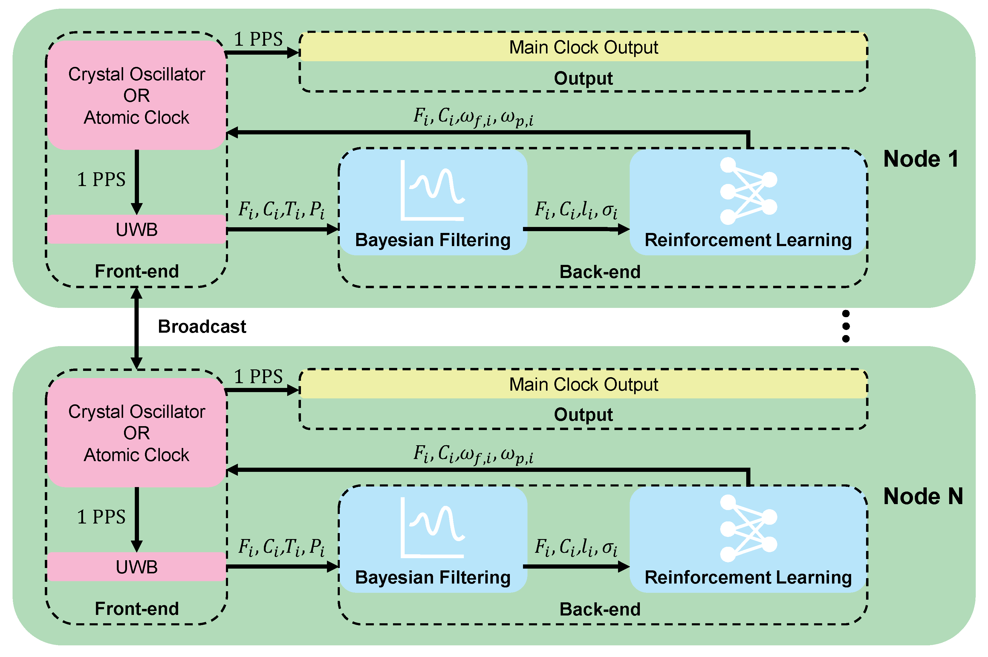 5], to address the issues mentioned above, this paper proposes the DSTS architecture. This architecture is designed to achieve high-precision time synchronization for multi-sensor platforms, particularly in challenging and denied environments where GNSSs fail. The architecture consists of a front-end and a back-end. The front-end utilizes UWB sensor and various clock sources, such as chip-scale atomic clocks and crystal oscillators, to acquire local clock data and measurements of frequency and time differences relative to neighboring nodes. The back-end then employs Bayesian filtering to perform real-time optimization of the Time of Flight in communications with these neighbors, thereby reducing the impact of communication errors on time synchronization. Concurrently, using the DDPG algorithm [
