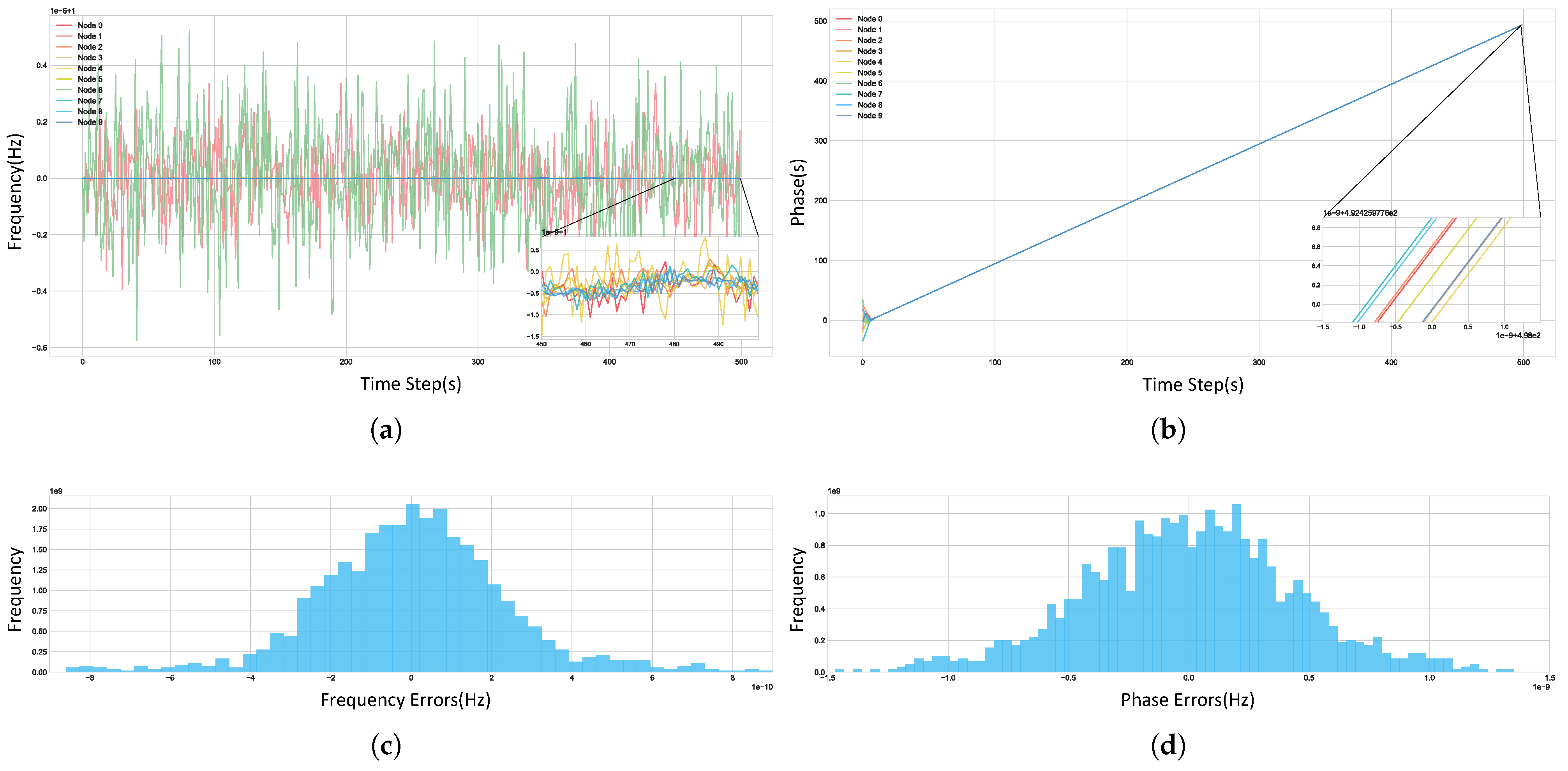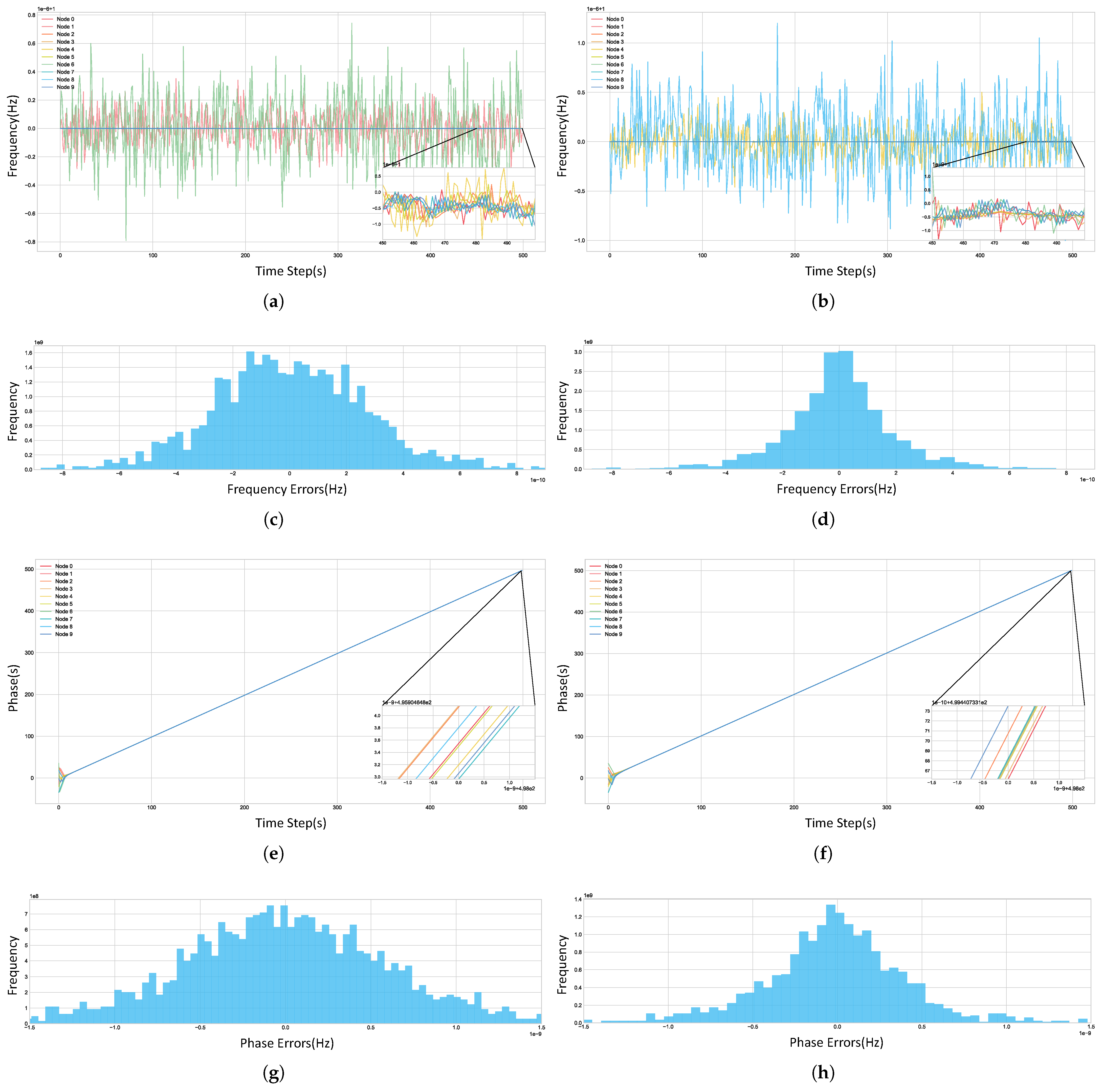 Specifically, in conjunction with our dataset, the frequency stability values assigned to the 10 nodes were set to the following sequence: [, , , , , , , , , ]. Frequency drift was simulated using a Wiener process based on these frequency stabilities. This setup was intentionally designed to create a mixed environment containing both stable and unstable clock sources, allowing for a comprehensive evaluation of our algorithm’s adaptive capabilities.