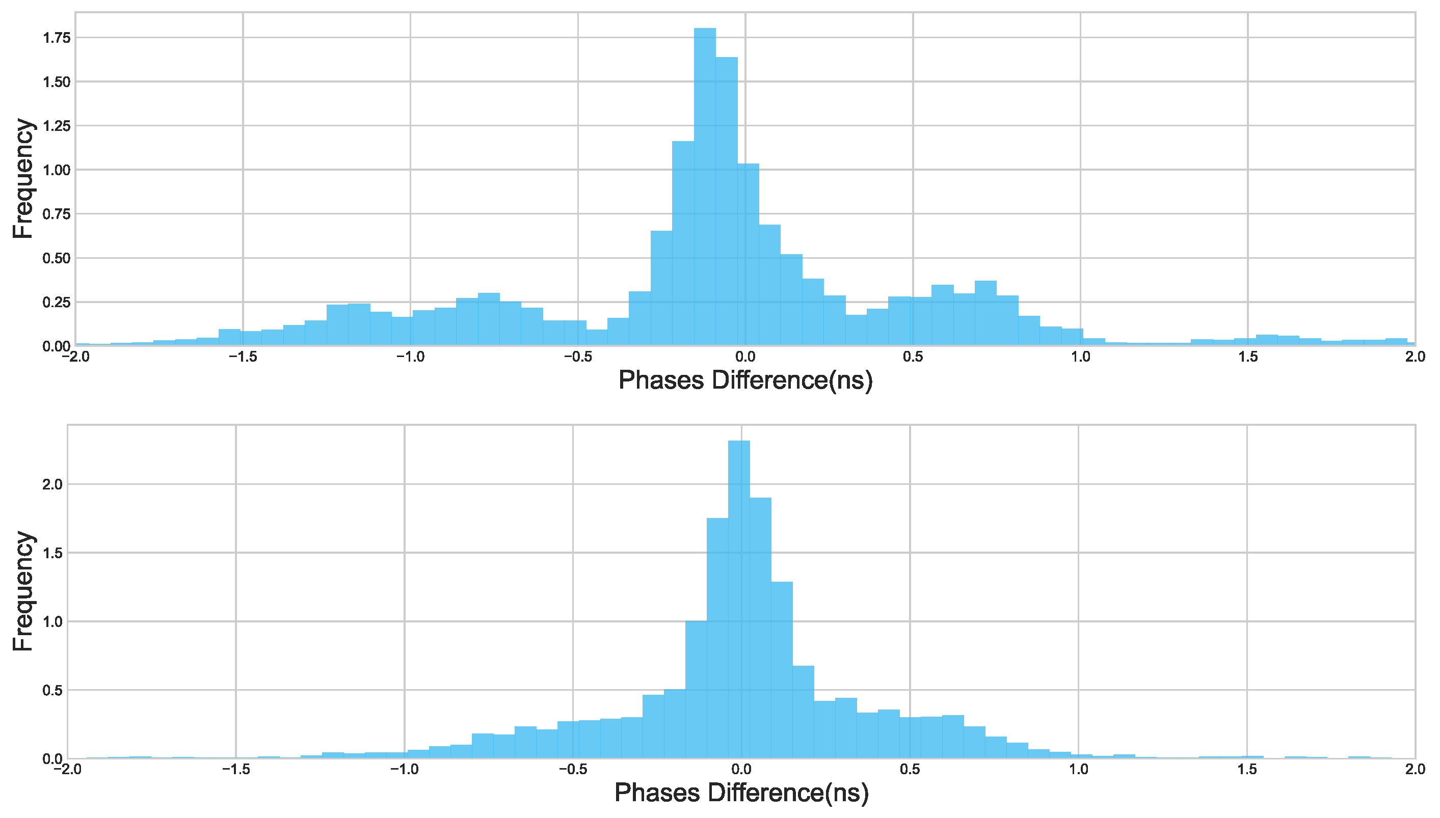 Figure 16 displays the probability density distribution histograms of the error between the estimated phase difference and the true phase difference, both before and after filtering. The subplot corresponding to the error distribution of the observed phase difference shows a standard deviation of 0.718 ns. In contrast, after being processed by the filter, the standard deviation is reduced to 0.438 ns, indicating a closer alignment with the true phase difference.
