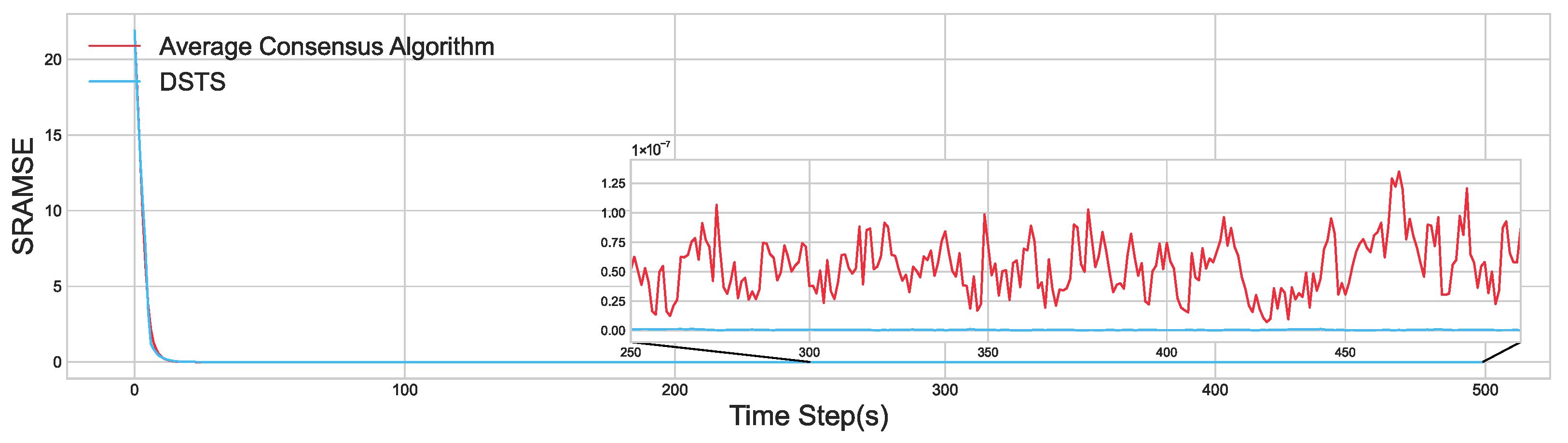 During the last 200 time steps of the test, the DSTS method achieved an average SRAMSE of with a standard deviation of . In comparison, the average-consensus algorithm yielded an average SRAMSE of and a variance of .