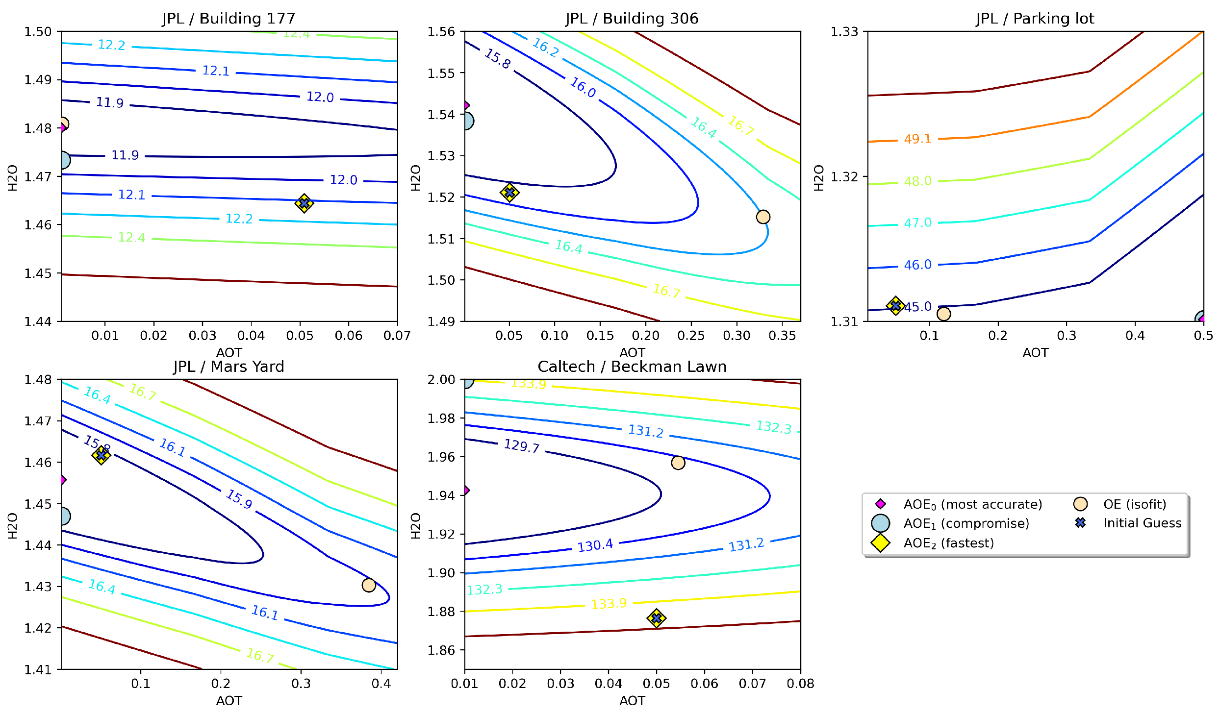 0, took around 10 ms to execute for 177, 306, PL, and Mars, while for BL, the inversion was slower, at 67 ms, yielding 15 retrievals/s on one core. The AOE