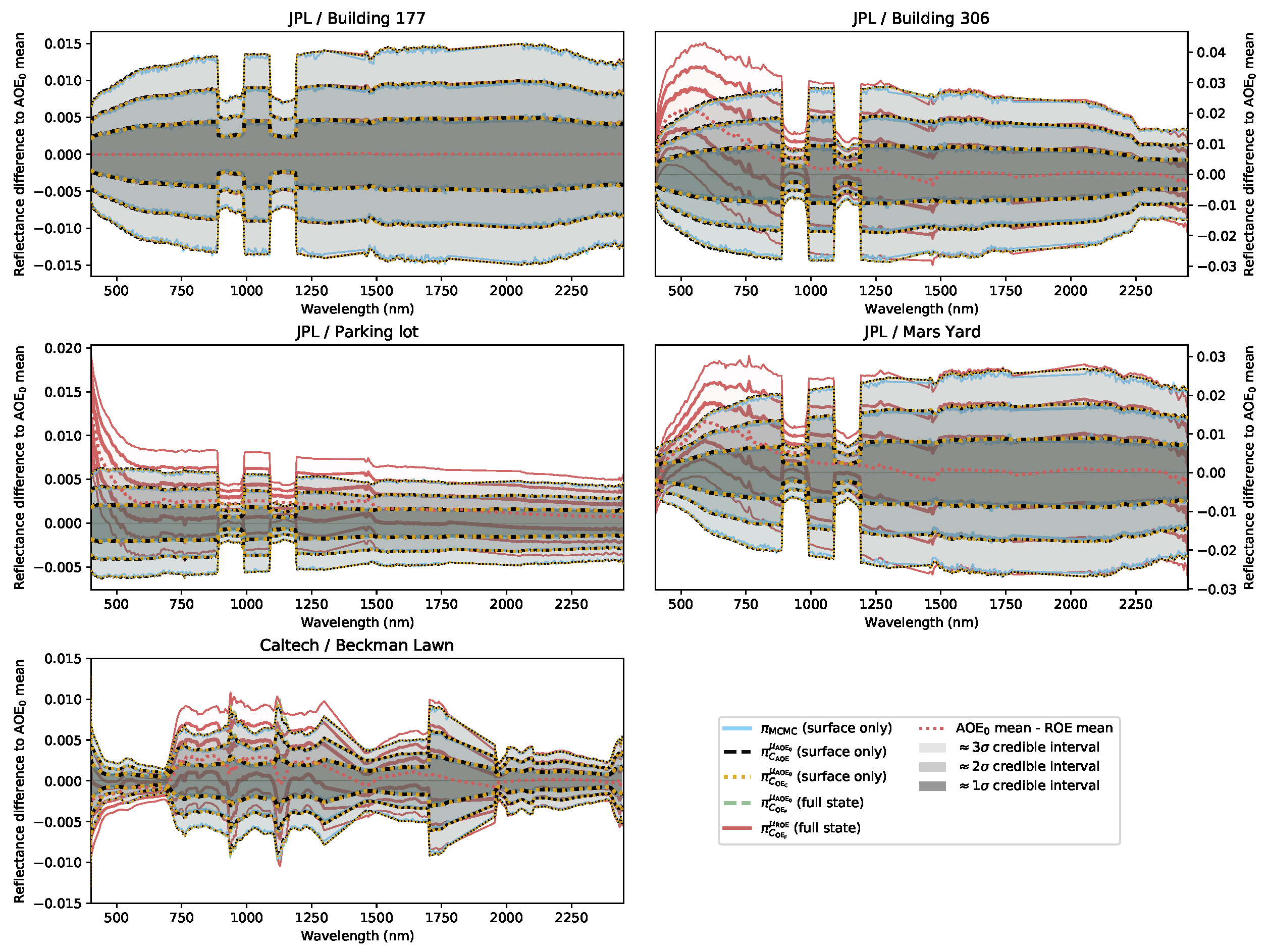 Figure 5 shows, for each scene, the first, second, and third standard deviation envelopes of the posterior distributions produced by the different retrieval and covariance estimation methods for all test targets. The distributions have been centered around the AOE
