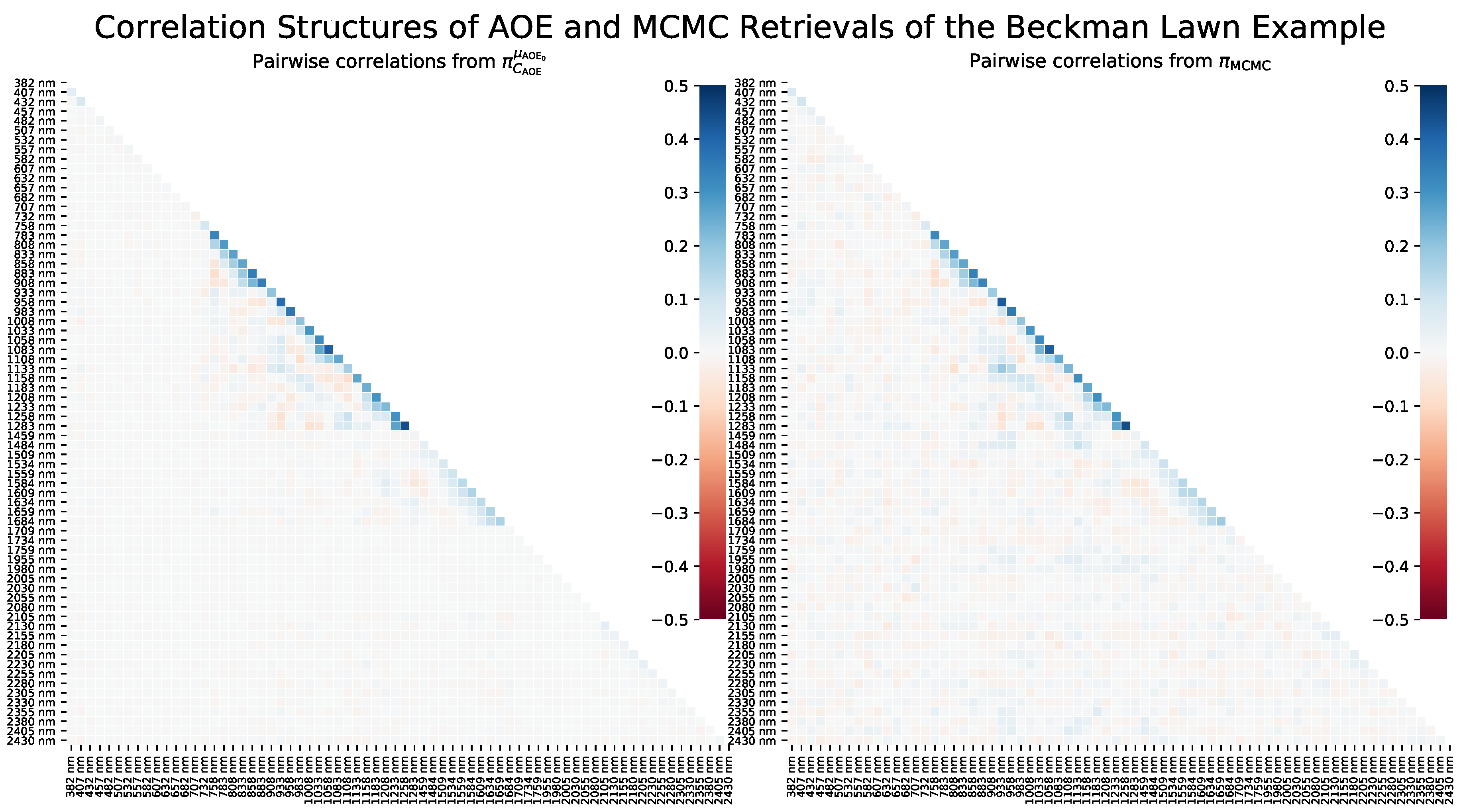 Figure 5 suggests that the AOE posterior covariance approximation described the cross-channel correlations accurately. The main difference is the noisiness of the MCMC correlation structure, which is to be expected, because MCMC is based on randomly sampling the posterior distribution. According to
